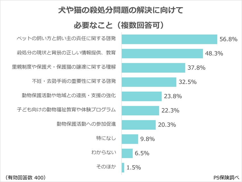 一方で、殺処分問題の解決には飼い主一人ひとりの意識向上と行動が必要であり、多くの人が、社会全体で支えるための仕組みや、情報提供の充実が大切だと感じています。