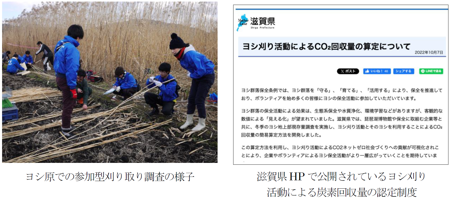 本論文では、琵琶湖周辺のヨシ刈り活動で回収される炭素量を推定するために、西の湖のヨシ原において参加型刈り取り調査を実施し、群落高法を応用した簡易的な現存量推定法の開発を行っています。滋賀県では、本研究で提案した簡易的なヨシ群落の現存量推定法を用いて、ヨシ刈り活動による炭素回収量の認定制度がつくられており、研究成果に基づくヨシ刈り効果の「見える化」が進められています。
