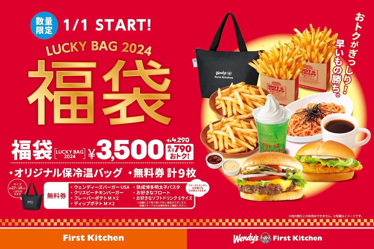 ウェンディーズ・ジャパン株式会社及び、ファーストキッチン株式会社(所在地:東京都新宿区、代表取締役:紫関修)が展開する、ウェンディーズ・ ファーストキッチンとファーストキッチンでは、2024年1月1日(月)10時から、オリジナルの福袋を数量や店舗を限って販売します。福袋「ラッキーバッグ2024」(3,500円)は、オリジナルの保冷温バッグに加え、ハンバーガーやポテトなどの無料券が9枚ついていて、最大で790円お得に商品をお楽しみいただけます。オリジナルの保冷温バッグは、この機会でしか手に入らない限定品で、ウェンディーズ・ファーストキッチンとファーストキッチンで異なるデザインをご用意しました。お得が詰まった「ラッキーバッグ2024」を、ぜひお買い求めください。