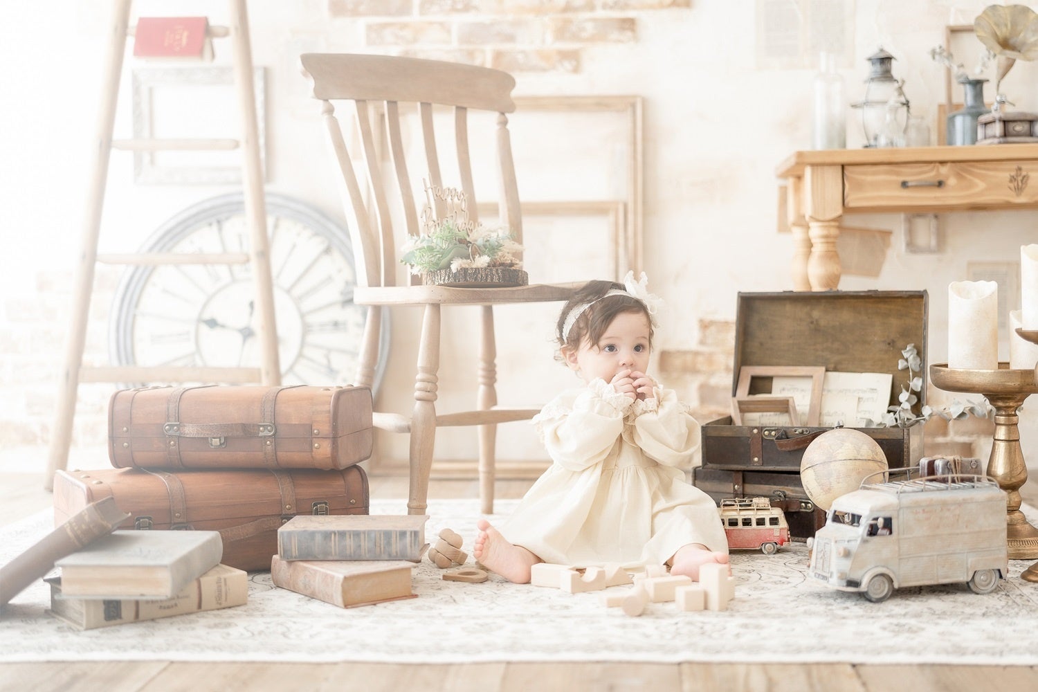 好奇心いっぱいにくるくる変わるお子さまの愛らしい表情を、一瞬たりとも逃さずお写真に仕上げられるよう、どこを切り取っても画になるように計算し尽くされているのがスタジオコフレの特長の一つ。川崎たまプラーザスタジオにはホームパーティのようなワクワクするイメージに拘った6つのセットがあり、それぞれに⾊味を統一した「ワントーンフォト(R)」(※1)の世界観が広がります。また千歳飴やバースデーケーキなどの撮影小物も手作りしており、細部まで妥協のないこだわりが独自の世界観を創りあげています。