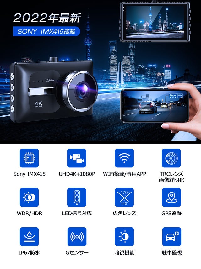 高精細4k画質で、昼はもちろん、夜にも鮮明に記録可能、周囲の車のナンバープレートも読み取れます。最新TRCレンズを採用し、低照度環境でもより多くの光を収集し、圧倒的に明るい夜間撮影が可能です。東日本 / 西日本の異なる周波数でもしっかり録画します。約89mm×34mm×50mmの超コンパクト設計により、場所を取らずに車内にスッキリ設置できます。