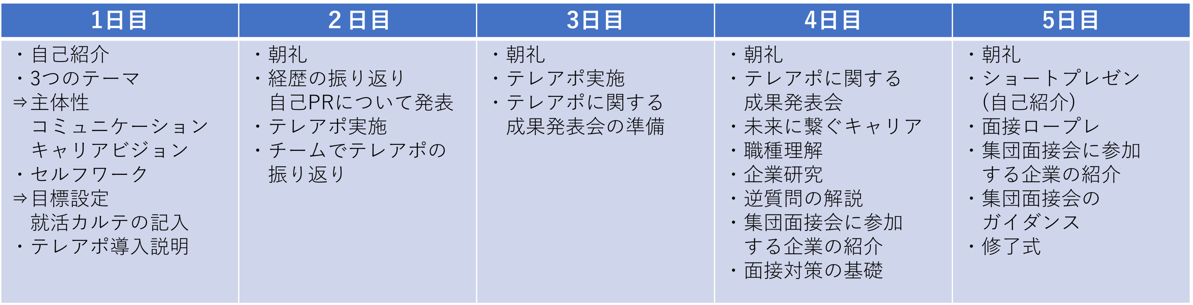 飛び込み実習の廃止、および就職支援講座と集団面接会のオンライン化といった変化の中で、受講生からは「飛び込み実習が不安だったので、廃止されて安心した」、企業からは「社内にいながら面接ができるので、面接会に参加しやすい」といったお声を頂いた一方で、受講生からは、「面接でアピールできるような経験がない」、「社会人経験が全くないので、就職後にやっていけるか自信がない」、企業からは「飛び込み実習がなくなり、オンラインでの面接になったことで、受講生の人柄や強みがわかりづらくなった」、「一部在宅勤務の日もあるので、自宅からでも主体的に営業活動ができる人を採用したい」といったご要望をいただくようになりました。