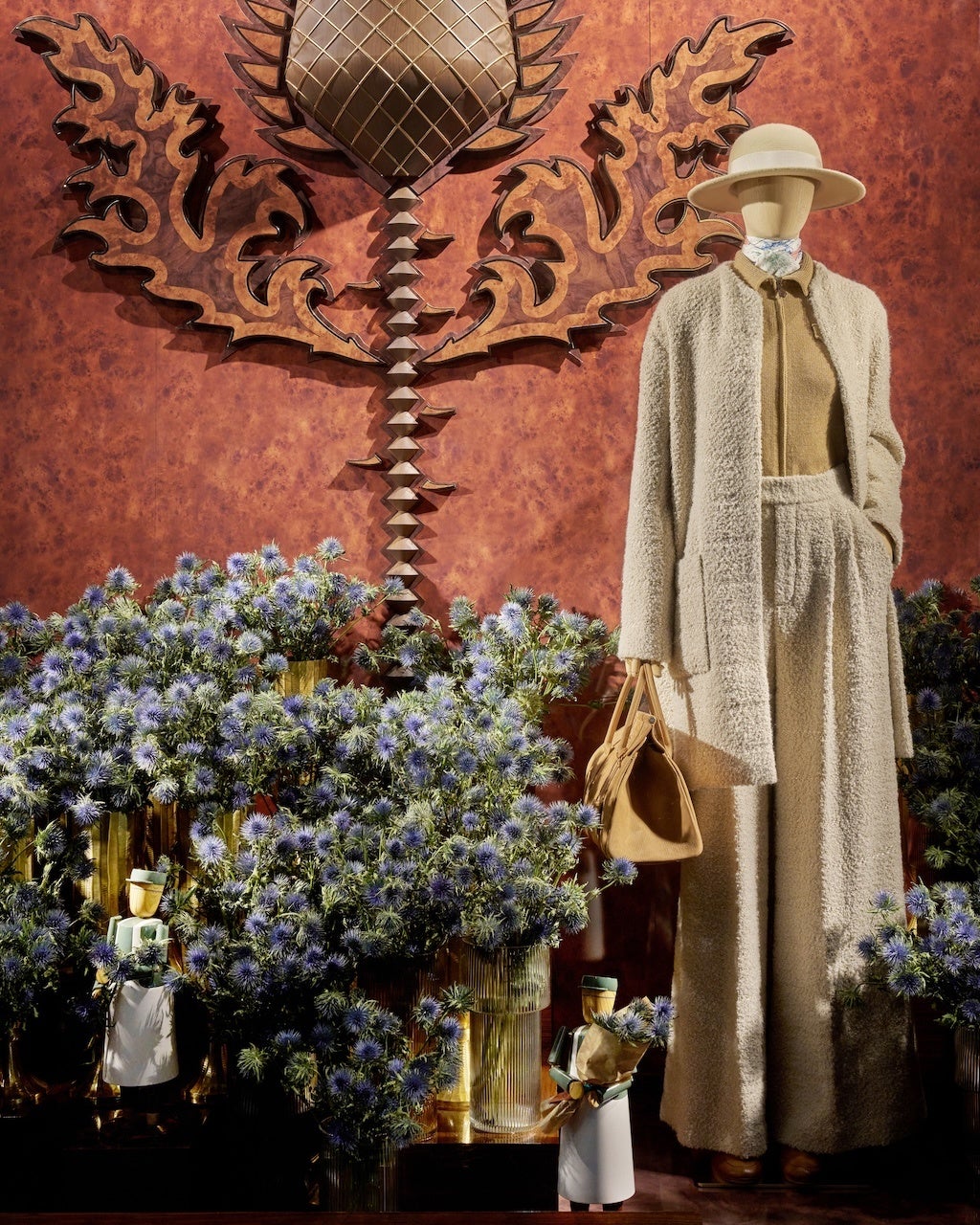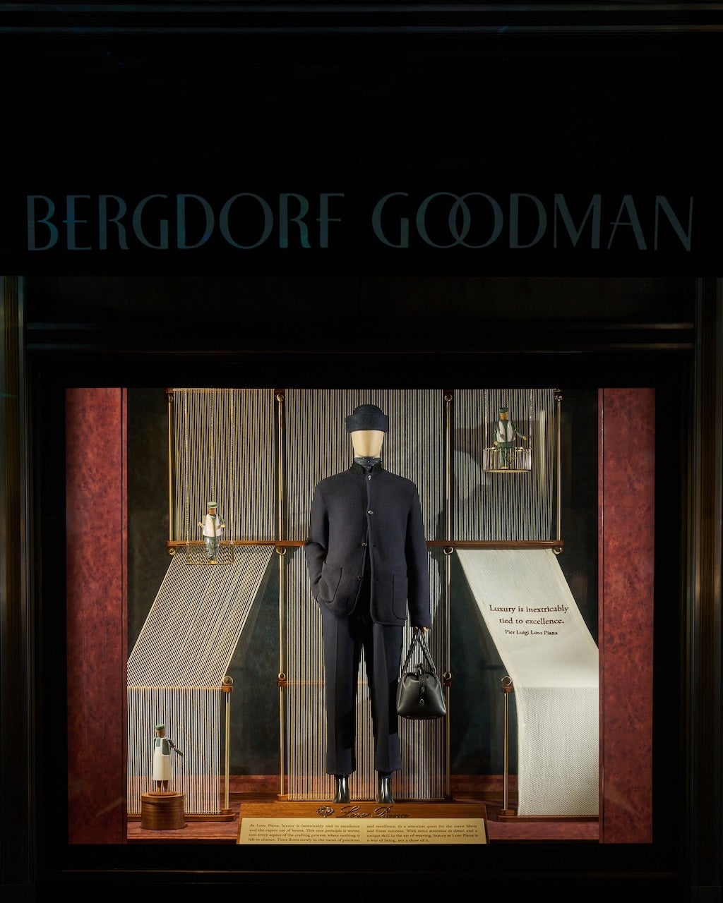 バーグドルフ・グッドマンのメンズおよびレディスストアの魅惑的なウィンドウは、ロロ・ピアーナのコードを、卓越したディテールと素材で称え、創造性、伝統、そして遊び心を融合します。独特のアールデコ調の雰囲気が漂うウィンドウは、メゾンの創業以来の価値観、歴史、独自性への探求、そしてニューヨークという街への賛歌です。ロロ・ピアーナの職人を表現した木製の人形が飾られ、輝くゴールド、ディープブラウン、ダークグリーンといった豊かな色彩のパレットが彩りを添え、1924年以来続くメゾンの伝統と歴史を物語ります。