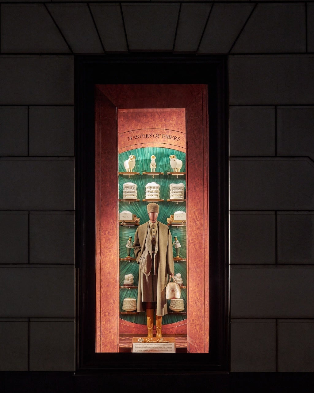 レディスのウェアに焦点を当てた最初のウィンドウは「繊維の達人」と題され、カシミヤなどの原材料が繊維の収納袋に詰められ、ミニチュアのロロ・ピアーナのトラックで運ばれ、繊細な生地へと織り上げられるためにイタリアへ向かう物語が描かれています。