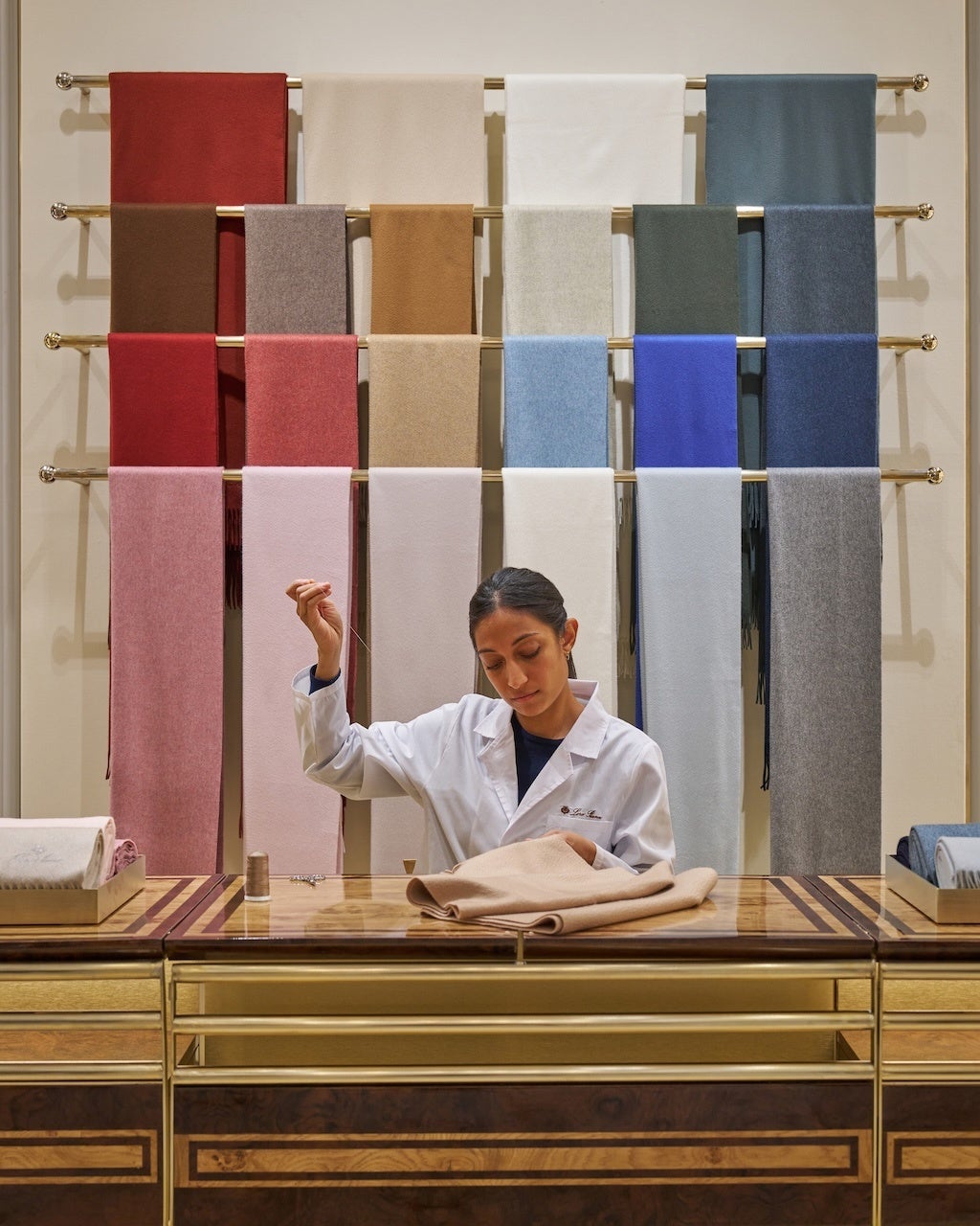 レディスのアクセサリーショップでは、グランデ・ウニタ・スカーフとウニト・ブランケットのパーソナライゼーションサービスを実施し、オーダー体験をさらに充実させています。ロロ・ピアーナの熟練した職人の監修のもと、お客様ご自身でスカーフとブランケットをパーソナライズしていただくことができます。イニシャルの特別な刺繍は、メゾンの独自性への追求を体現すると同時に、ヘリテージアイテムとしての魅力を高めます。アイテムは、アースカラーやニュートラルトーン、ピンクのパステルカラー、グリーンやブルーのシェード、そしてチェック柄にはレッドのアクセントなど、メゾンを象徴する落ち着いた色合いから鮮やかな色合いまで、幅広いカラーパレットで展開されています。