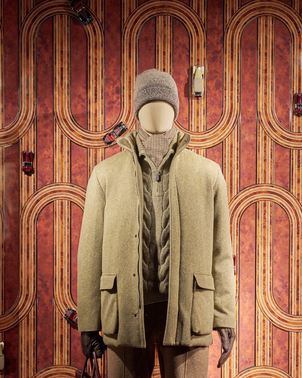 最初のメンズのウィンドウには、メゾンの象徴的なカラーであるクンメルを背景に、アイコニックなスーツケースストライプのモチーフをあしらったミニチュアのヴィンテージカーが展示されています。これは、ロロ・ピアーナのクラシックカーへの情熱と旅の芸術へのオマージュです。