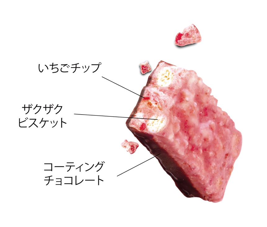 本商品は、ザクザクのビスケットといちごを組合せ、下部にミルクチョコレートをコーティングすることで、甘酸っぱいいちごの味わいを感じながら、ミルクチョコレートの優しい甘さとの一体感をお楽しみいただけるチョコバーです。