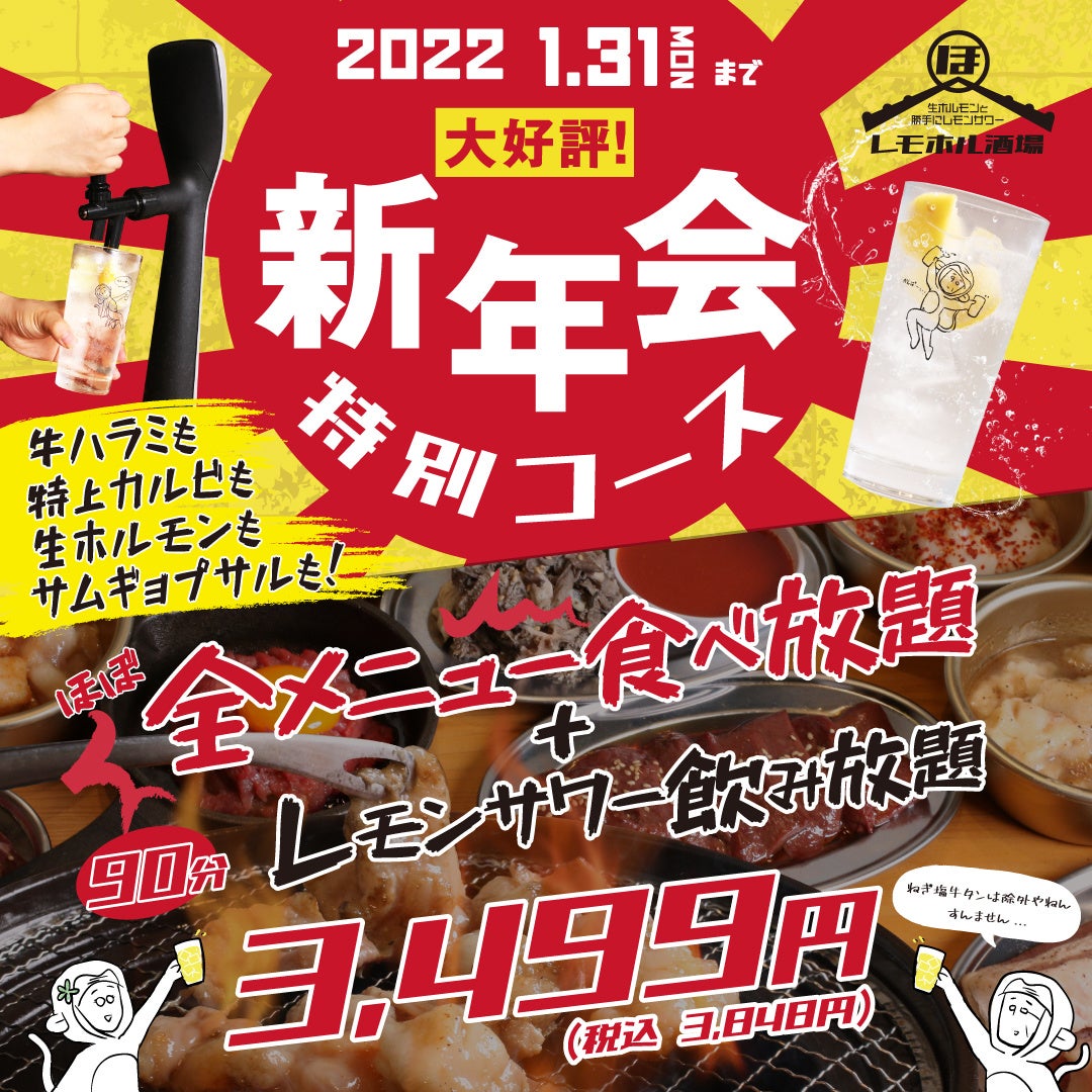 新年明けましておめでとうございます★今年も成長し続ける「レモホル酒場」を何卒宜しくお願い致します。早速ですが、レモホル酒場では新年会の特別コースを1月8日(土)~1月31日(月)までの期間実施致します!!その特別コースには牛ハラミ、特上カルビその他の人気のお肉も含め、ほとんどのメニューが食べ放題の上に、更にレモンサワー90分飲み放題がついて3,499円(税込:3,848円)で楽しめちゃいます!