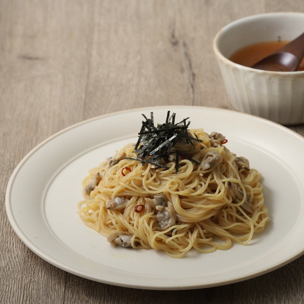 缶詰のアサリと海苔を使った、海の旨みたっぷりのペペロンチーノです。茹で鍋1つで作れて、使う食材は常備できる食材ばかりなので、ぱぱっと作りたいランチにぴったりです。