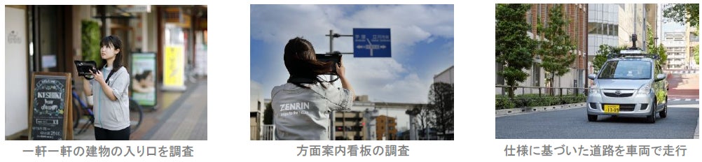 ゼンリンは、国内カーナビゲーション用の地図データで大きなシェアを持ち、独自調査から収集・整備した地図データをナビメーカー等に提供しています。全国約70拠点の調査網で、徒歩調査による建物の入り口情報や方面案内看板の取得、全方位カメラを搭載した調査車両による道路規制情報等の取得など、カーナビゲーション機能の向上に貢献する情報を整備しています。