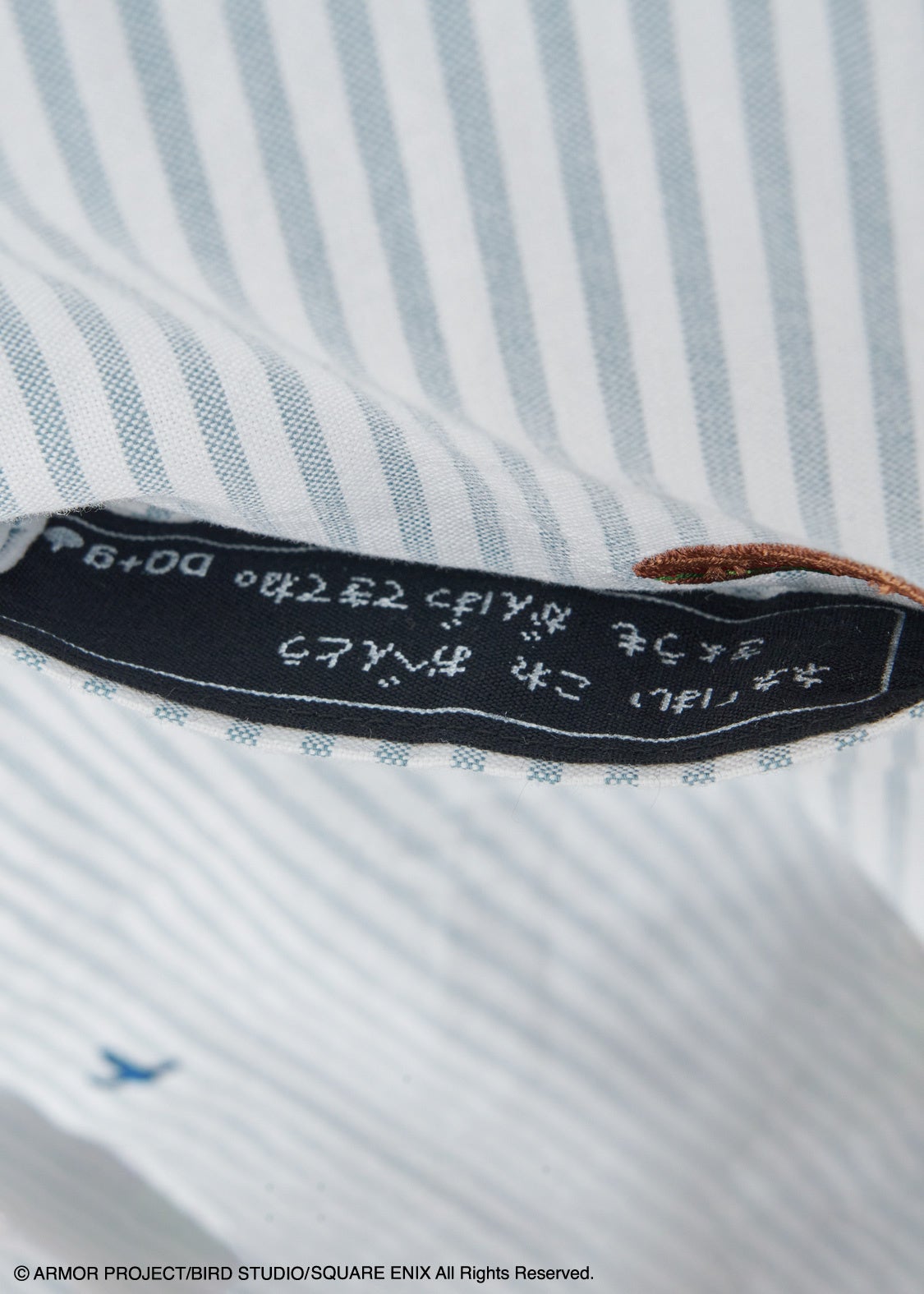 「トルネコ」になれちゃうシャツ。「ドラゴンクエストIV 導かれし者たち」に登場するトルネコをイメージした、ストライプ柄と配色が特徴的なデザイン。フロントに、ドラゴンクエストおなじみの武器のシルエットと、トルネコのシルエットが刺繍されています。