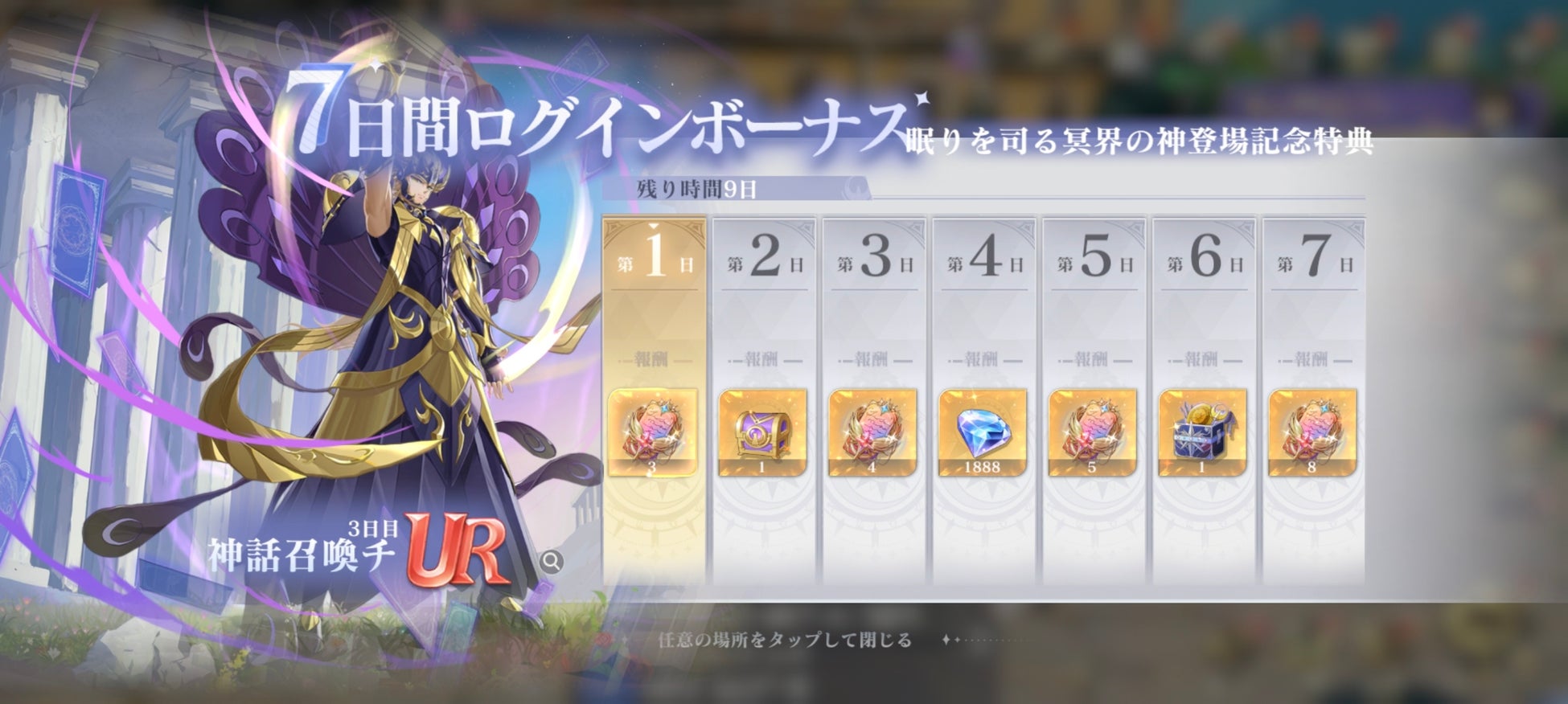 神話召喚チケットを使用してUR「眠りを司る神・ヒュプノス」を手に入れよう!