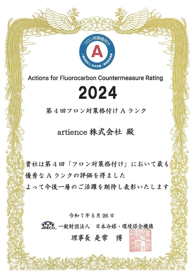 artience株式会社(代表取締役社長 髙島 悟、東京都中央区)はこのたび、フロン類の適正な管理を経済産業省や環境省とともに啓発・推進する一般財団法人日本冷媒・環境保全機構(理事長 是常 博、東京都港区、以下「JRECO」)による、フロン排出抑制法への取り組み評価「第4回 JRECOフロン対策格付け」において、2年連続でAランクを取得いたしました。