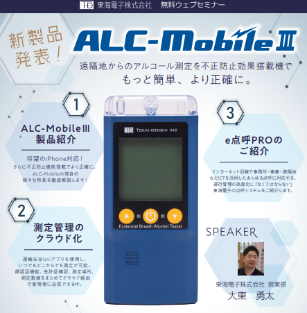 東海電子、アルコール検知器の新製品発表セミナー<ALC-MobileⅢ>遠隔地からのアルコール測定をもっと簡単、より正確に。4月28日(金)