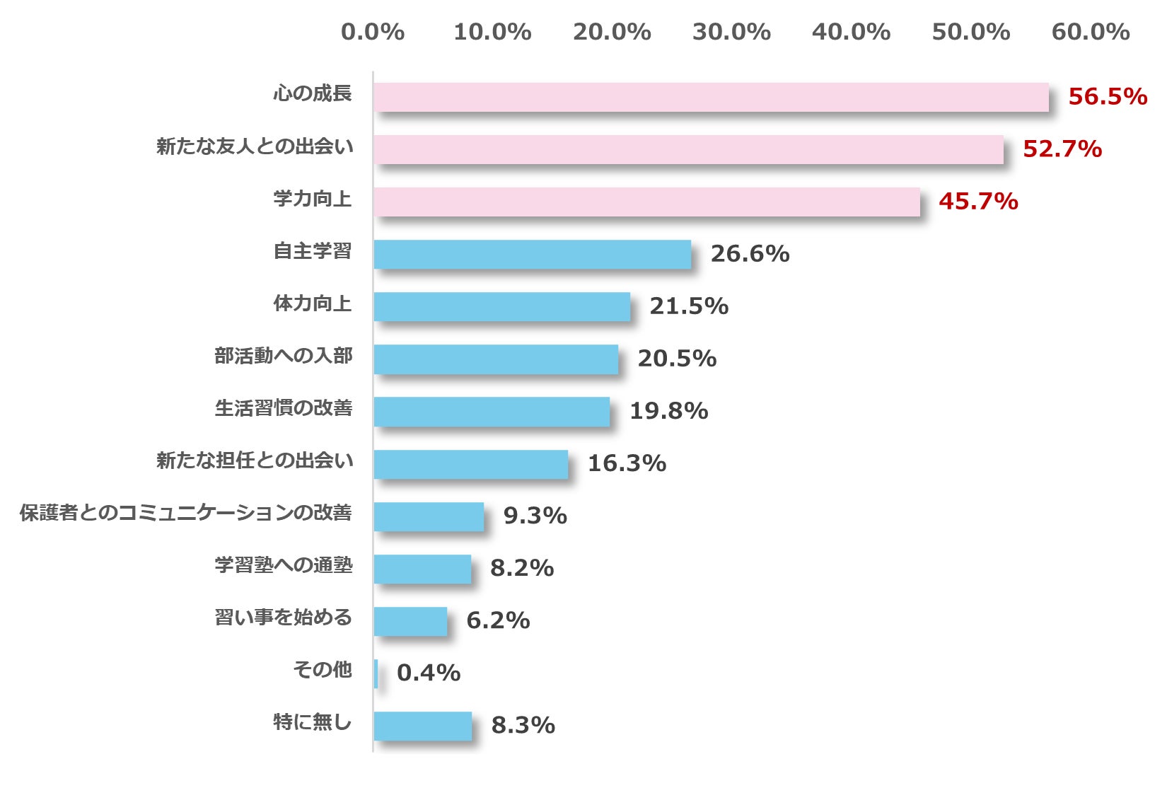 中学生の子どもを持つ全国の保護者820名を対象に、子どもが進級・進学するにあたり、期待していることを質問したところ、最多回答は「心の成長(56.5%)」、次に「新たな友人との出会い(52.7%)」、「学力向上(45.7%)」と続きました。