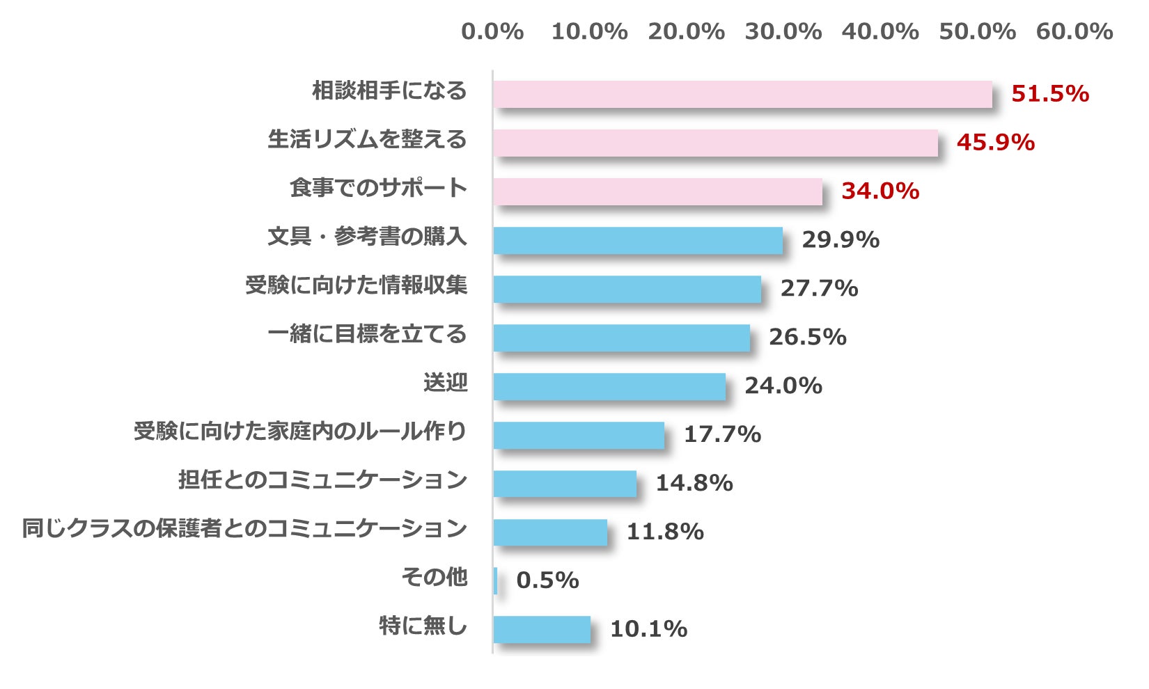 子どもの進級・進学時にどのようなサポートをしているか質問したところ、最多回答は「相談相手になる(51.5%)」、次に「生活リズムを整える(45.9%)」、「食事でのサポート(34.0%)」と続きました。