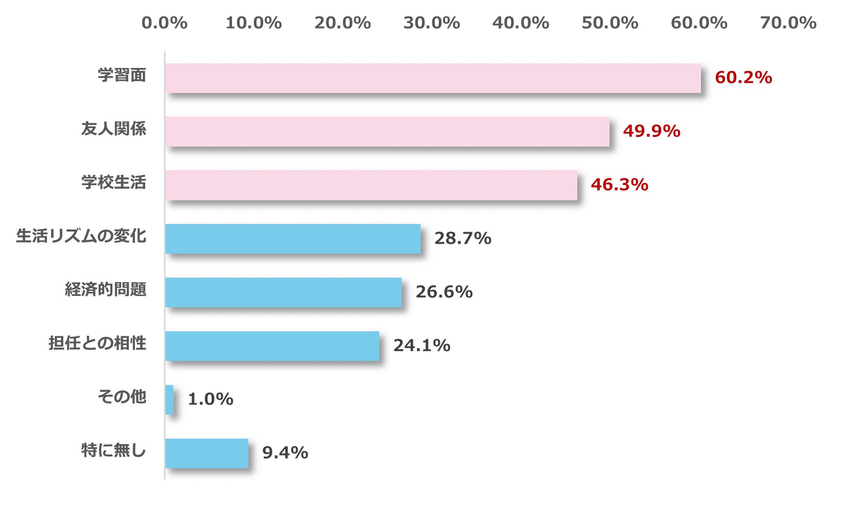 子どもが進級・進学するにあたり、不安に感じていることを質問したところ、最多回答は「学習面(60.2%)」、次に「友人関係(49.9%)」、「学校生活(46.3%)」と続きました。