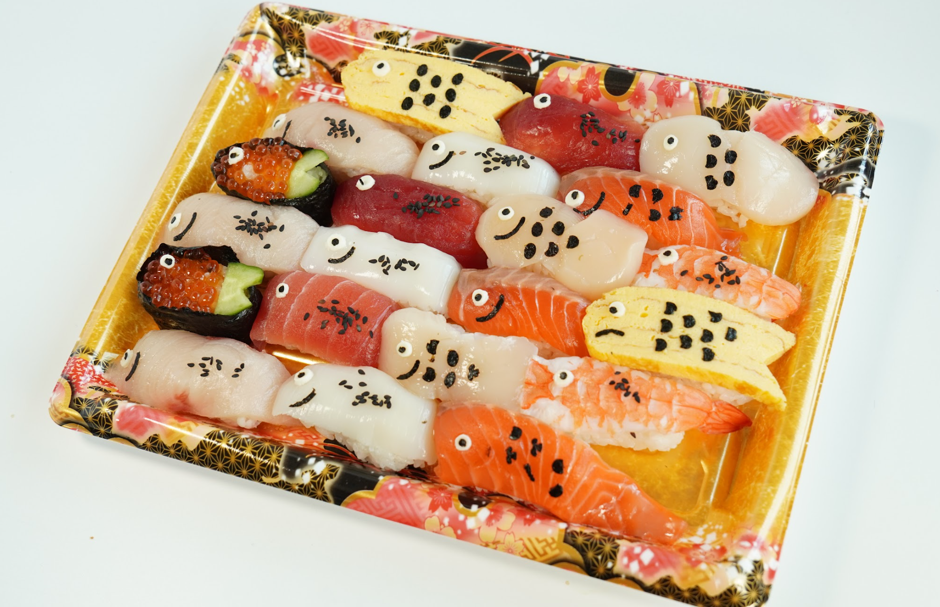 商品特徴:見た目のインパクト間違いなし!横に並べたにぎり寿司をお魚に見えるようにトッピングしました。玉子はカットし尾に見えるように切りつけ。キレイでおいしいお寿司!