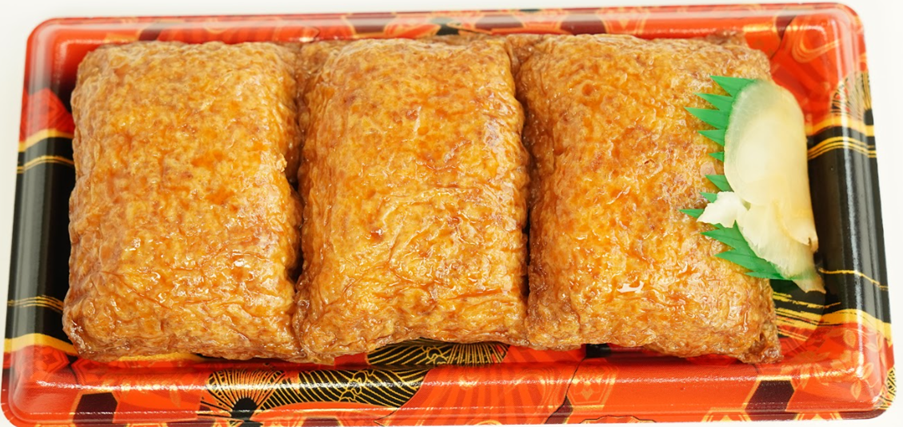 商品特徴:丸大豆から作った油揚げに黒糖をメインにした糖類、それに醤油等でシンプルに味付けし作り上げられたいなりです。当社独自配合の酢を合わせた酢飯との相性は抜群です。大き目の皮に多めの酢飯をいれることで、あえてかぶりつくように設計。噛んだ時に出汁が染み出ておいしさを更に感じていただけます。