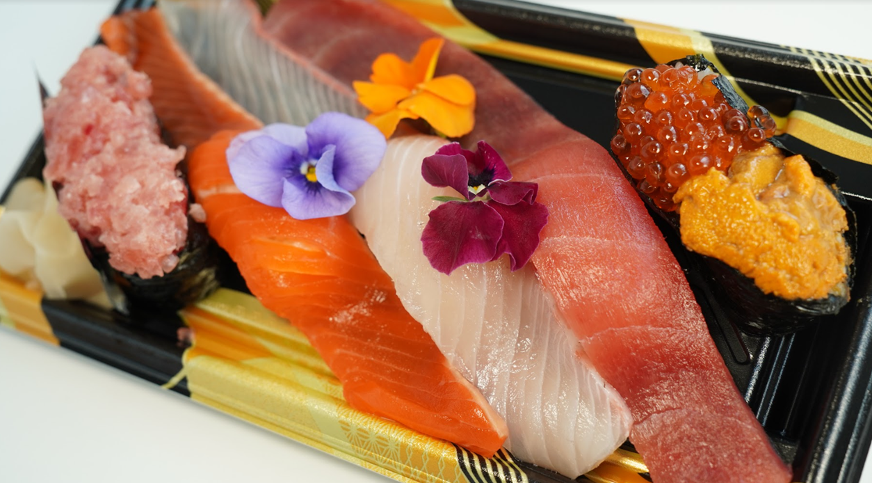 商品特徴:お客様が見て食べて楽しんでいただけるような、今までにない長いロングサイズのネタを使用したにぎり寿司です。見た目のインパクトとSNS映えするように食用のお花を添えたりと、とにかく楽しく、食べておいしい商品となっています。