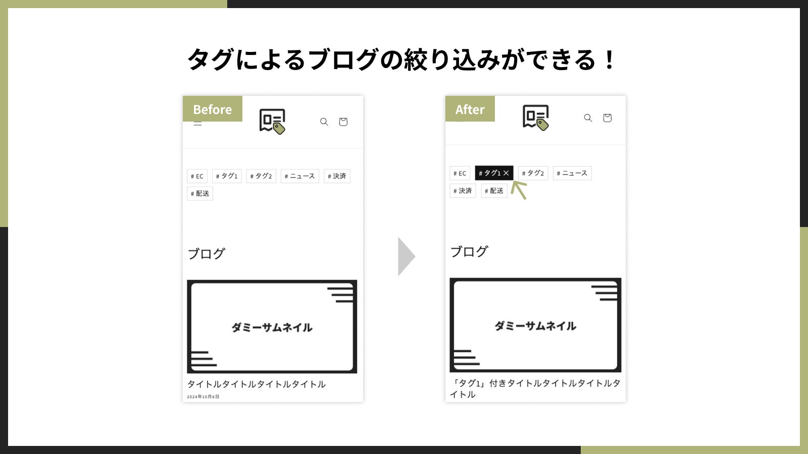 Shopifyアプリである「シンプルブログタグ絞り込み|お手軽タグ一覧挿入」を使うと、1 クリックでブログのタグによる絞り込みをテーマに追加可能です。