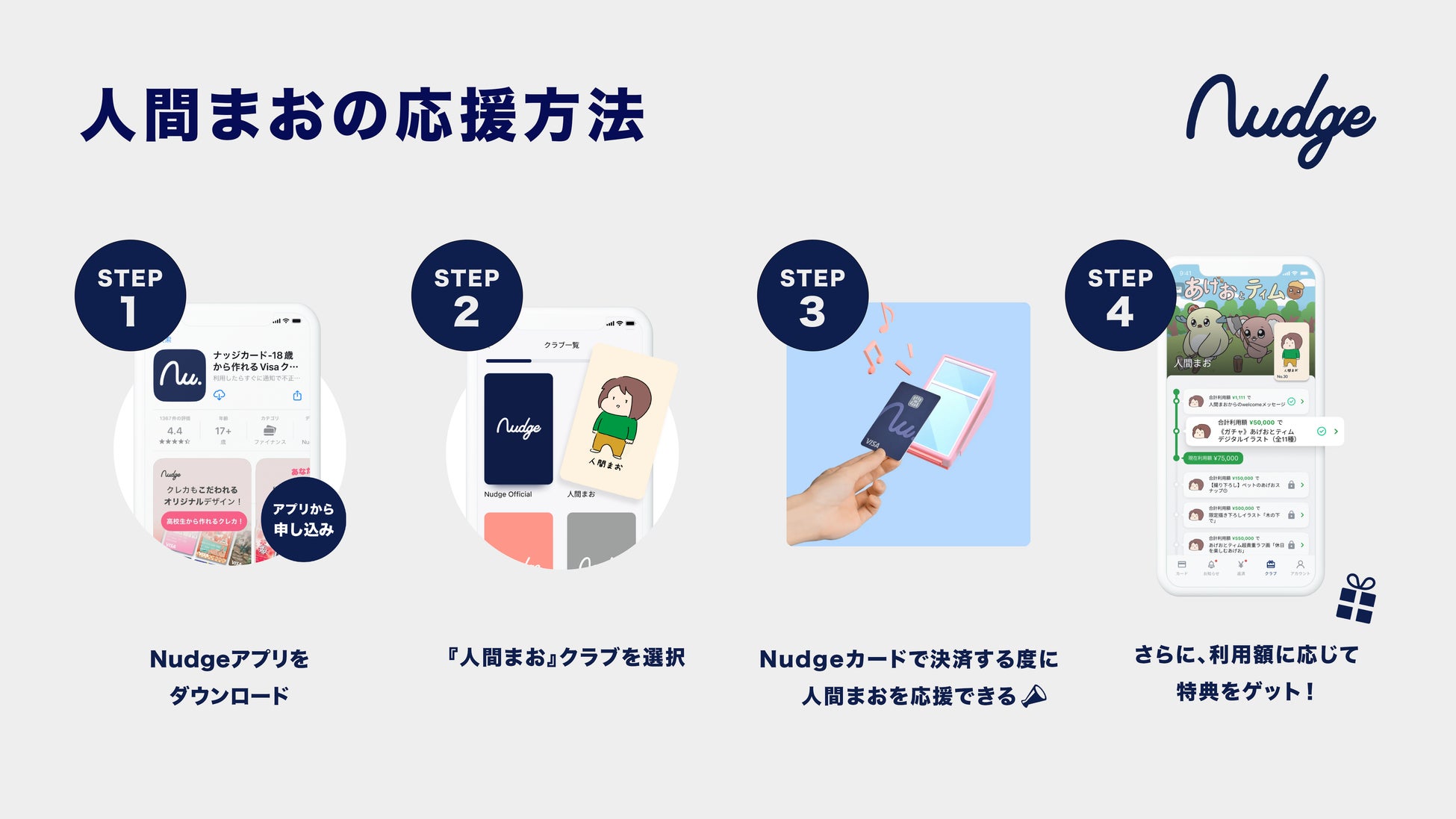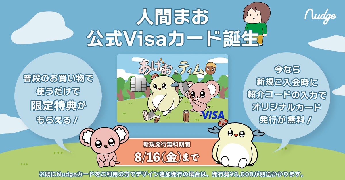日本におけるチャレンジャーバンクを目指すナッジ株式会社(本社:東京都千代田区、代表取締役:沖田 貴史、以下「ナッジ」)は、次世代クレジットカード「Nudge(ナッジ、以下「ナッジカード」)」において、本日7月16日、人気アニメ『あげおとティム』作者の「人間まお」クラブを開設しました。このクラブでは、ナッジカードをご利用いただくことで、その一部が人間まおさんの創作活動の支援に活用されます。