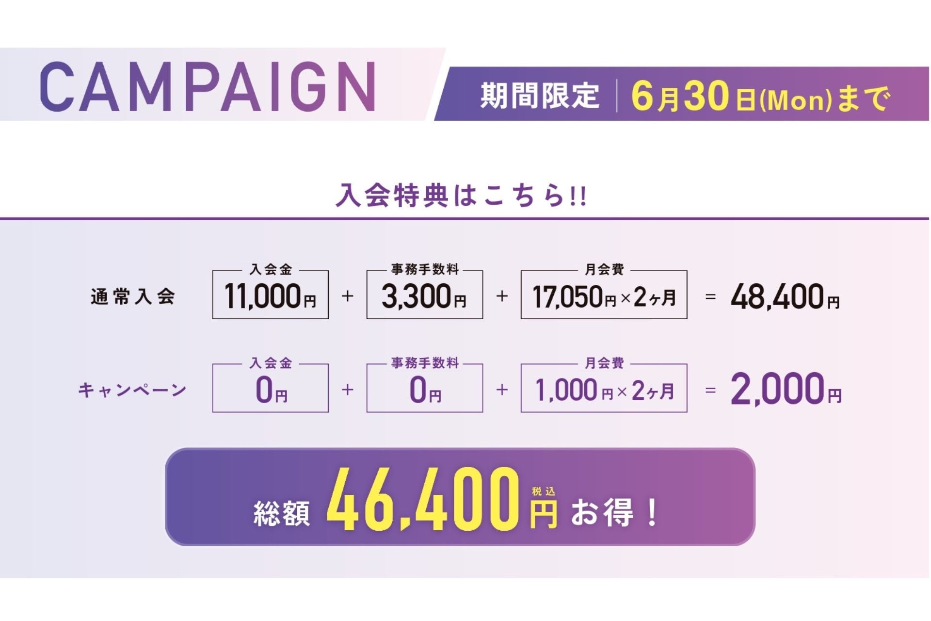 通常であれば、初回2ヶ月で必要な費用は 48,400円のところ、キャンペーン適用により 2,000円(月会費1,000円×2ヶ月のみ)となり、なんと!46,400円もお得になる過去最大級のキャンペーン。