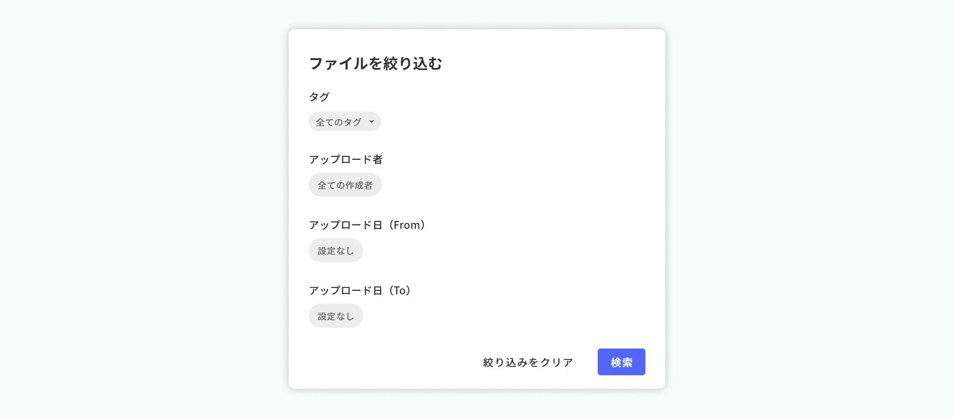 この度、アップロードしたファイルをフィルタリングできるようになりました。これにより、タグ付けした内容や、アップロード日時で絞り込みができるようになりました。これにより、表示したいファイルを簡単に一覧表示することが可能になります。