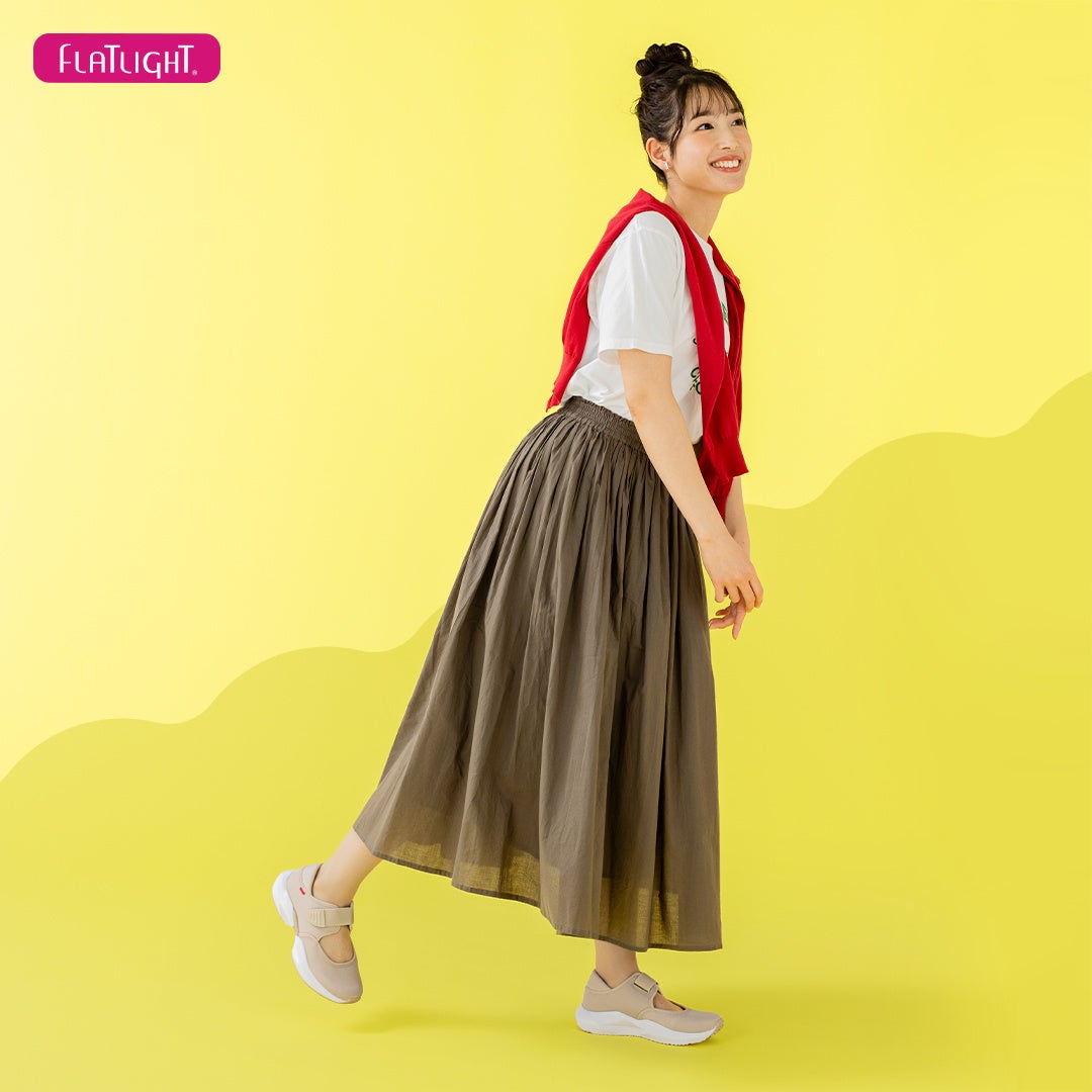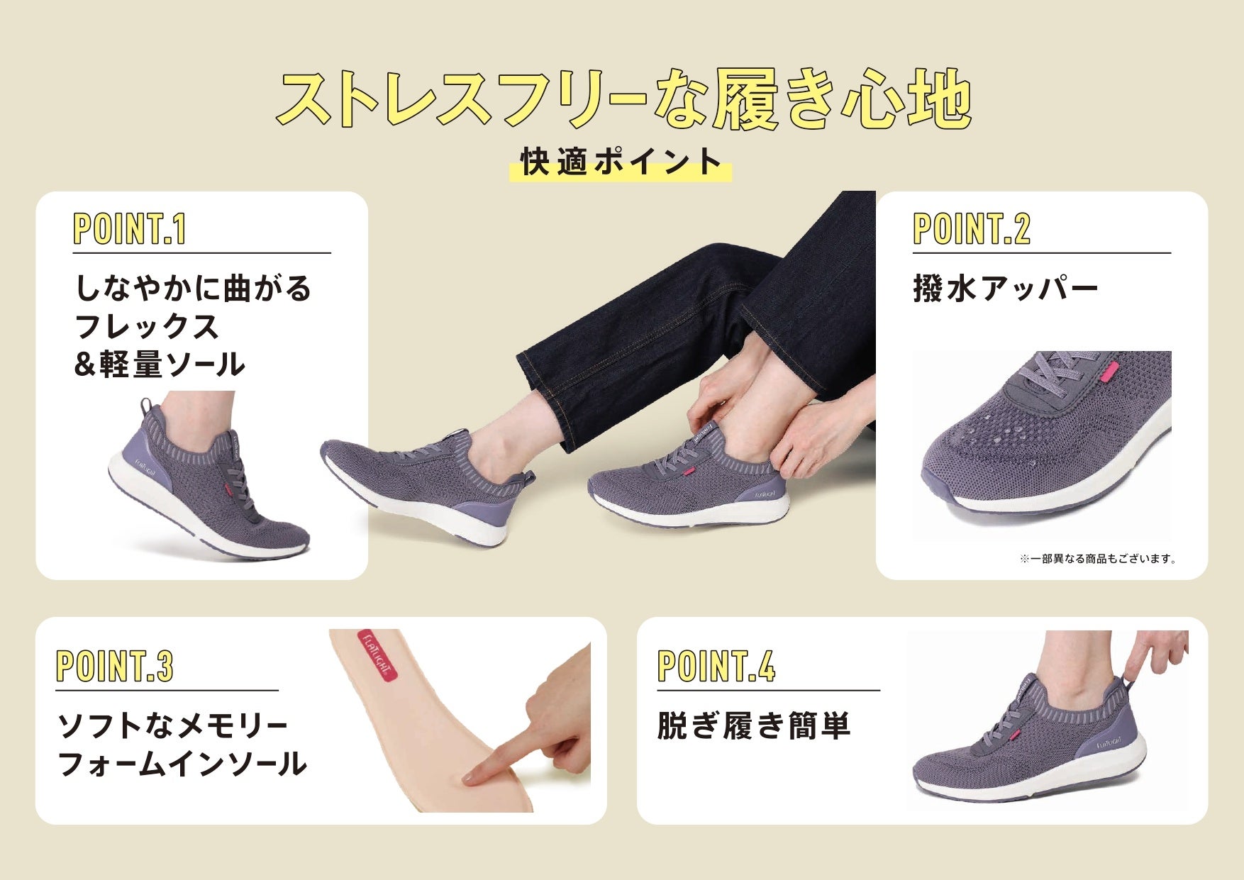 ふんわりとしたクッション感のあるインソールで足をやさしく包み込み、履き心地のいいスニーカーとなっています。さらに、軽量で弾力感のあるソールを採用し、足裏も疲れにくく長時間の着用にもおすすめです。