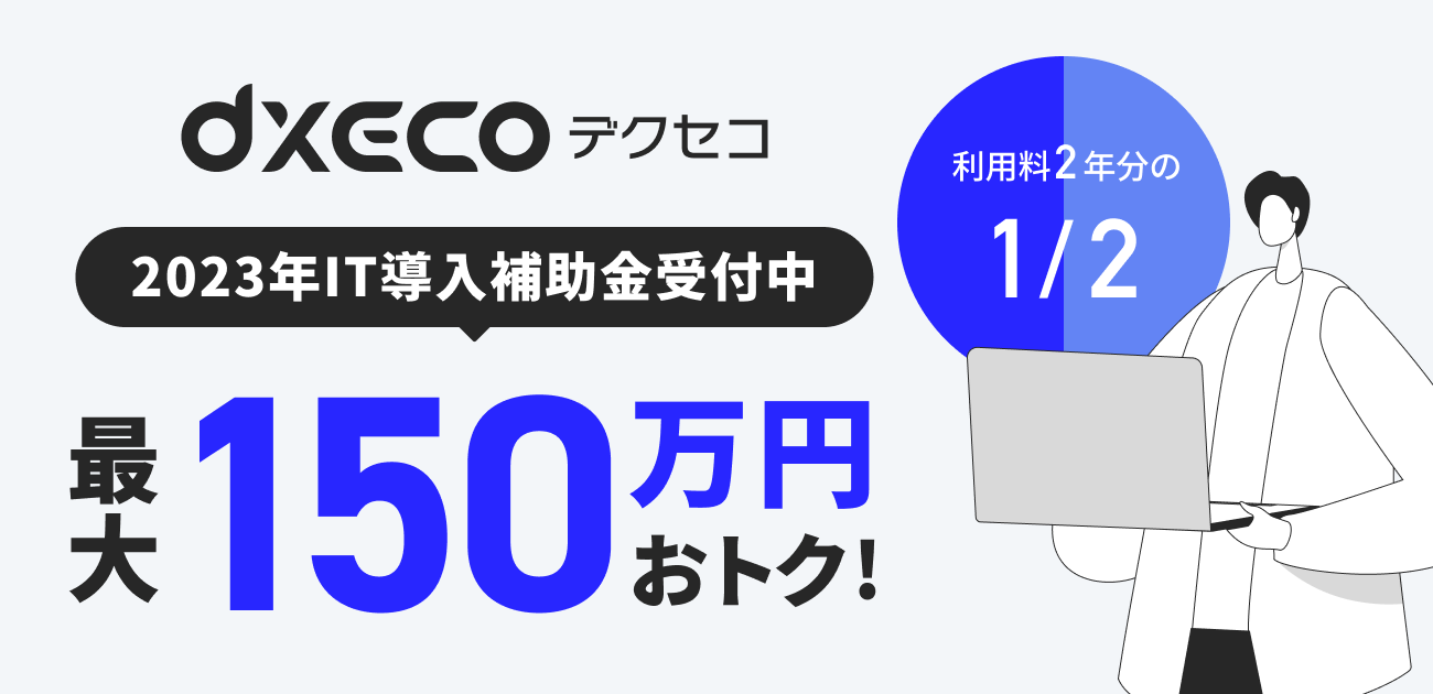 オロが提供するSaaS管理ツール「デクセコ」の新規導入も補助対象となり、一定の条件を満たした場合、利用料2年分の1/2、最大で150万円の補助が受けられます。
