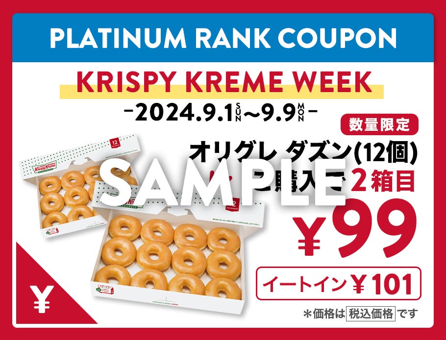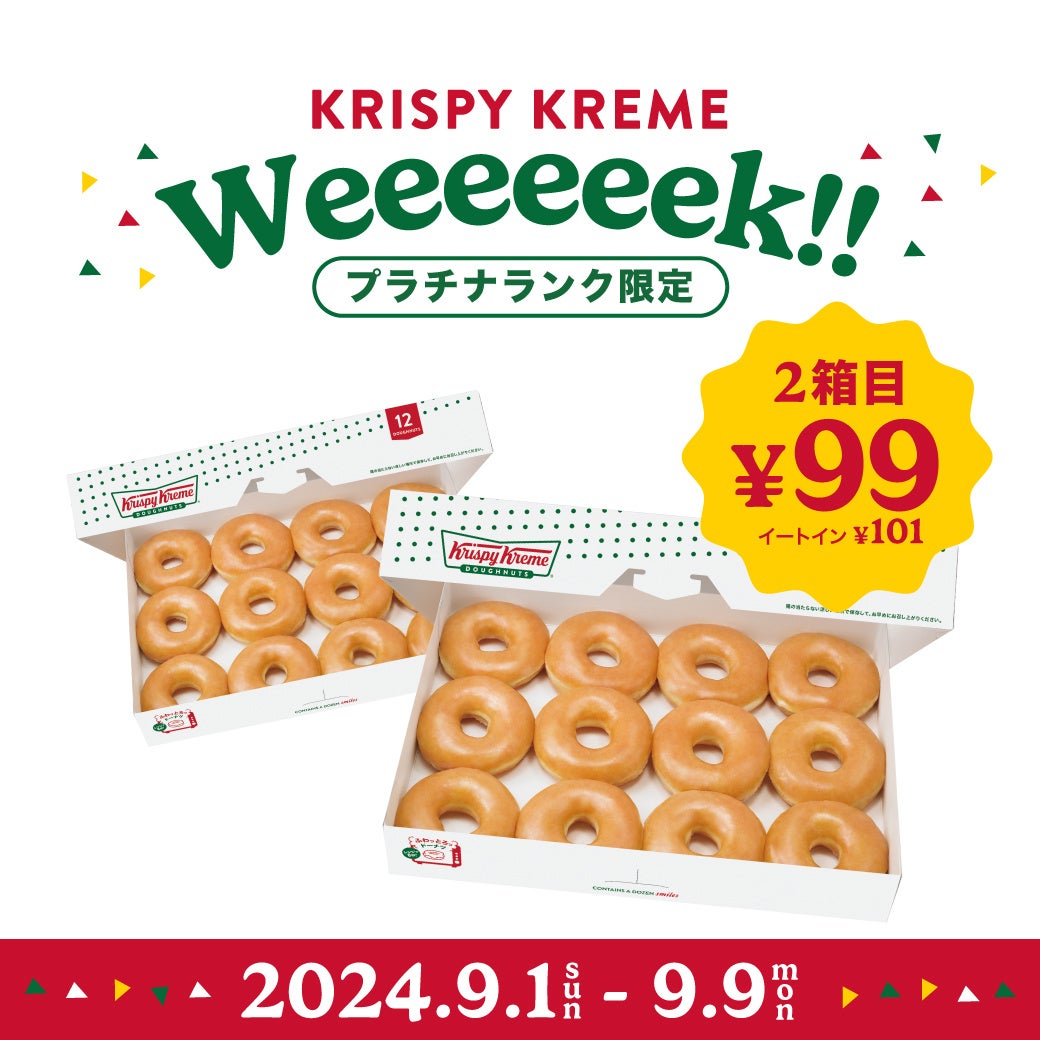 9月9日(月)は“クリスピー・クリームの日”。日ごろから『Krispy Kreme for APP』を頻繁にご利用いただいているプラチナ会員様への感謝の意を込めて、『KRISPY KREME WEEK』と題する9月1日(日)~9月9日(月)の期間、『オリジナル・グレーズド® ダズン』を1箱買うと、2箱目を特別価格99円(イートイン101円、通常価格1,728円、イートイン1,760円)でご購入いただけるクーポンをプラチナ会員様限定で発行します。