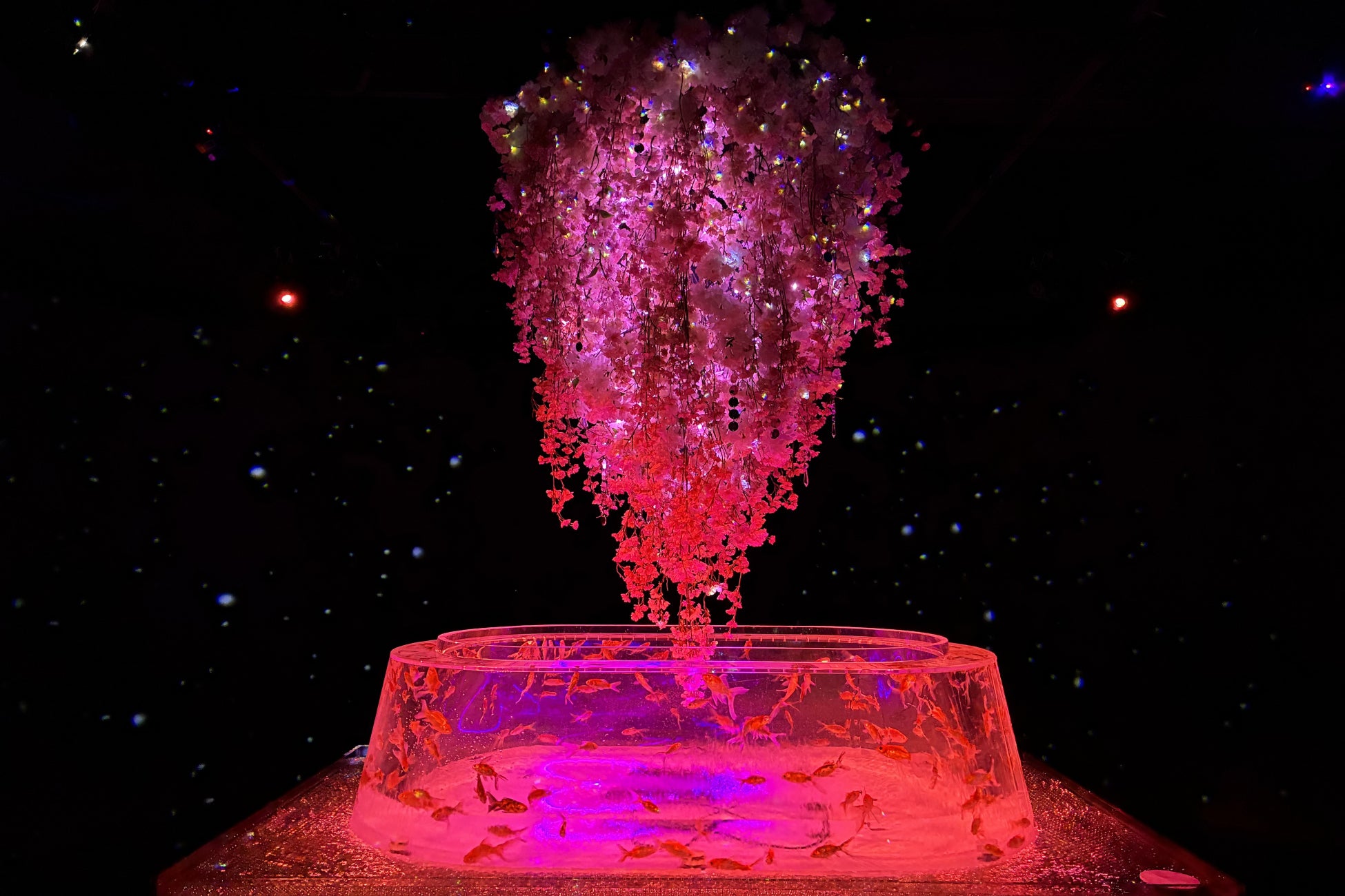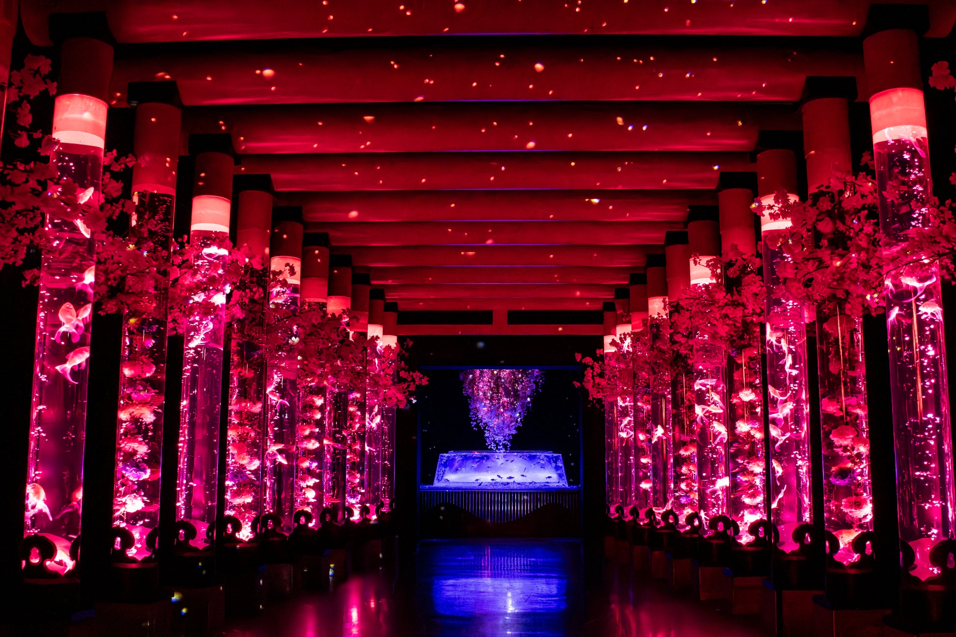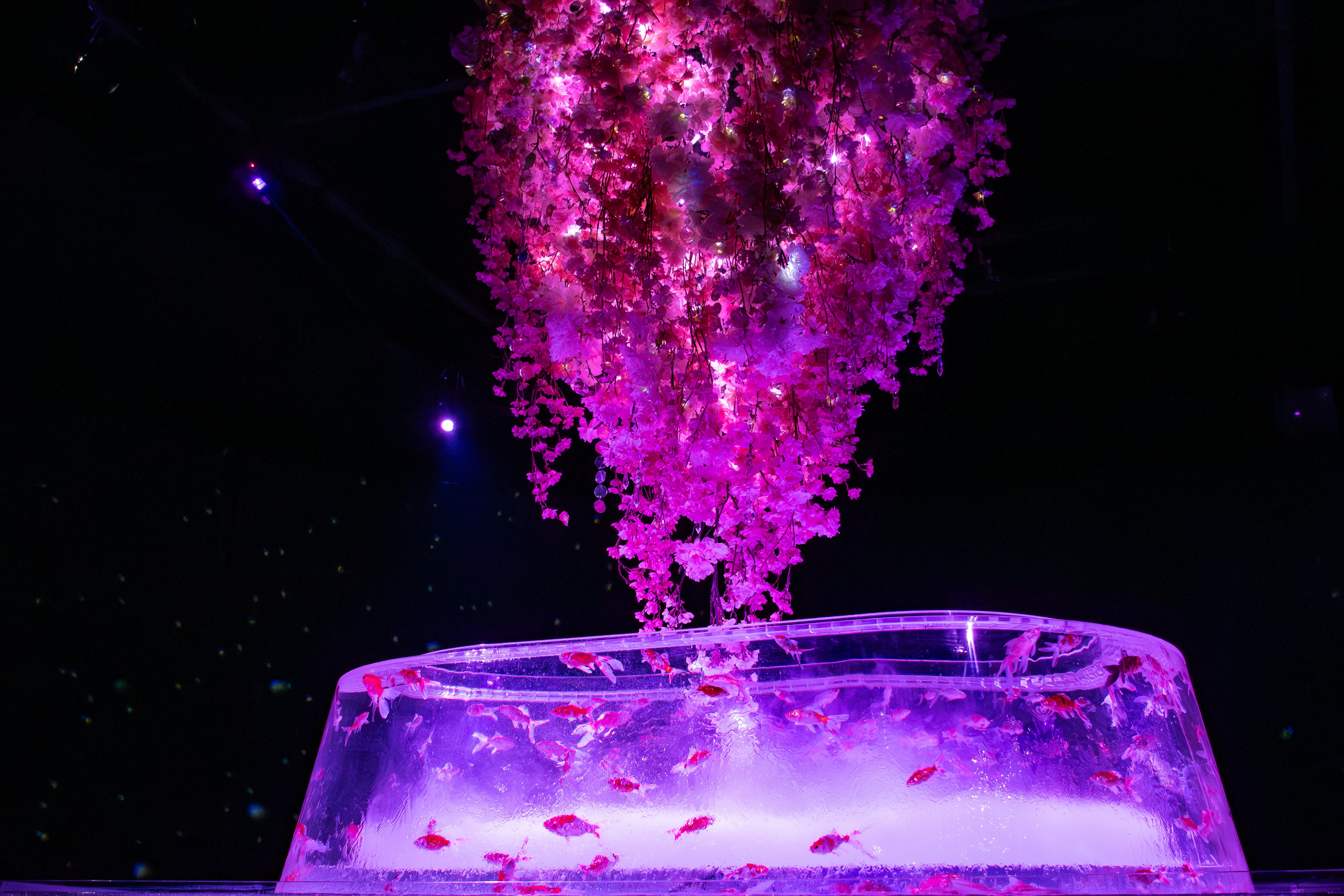 桜を道しるべに、金魚、光、そして花が一体となる幻想的で華やかな空間を創出します。