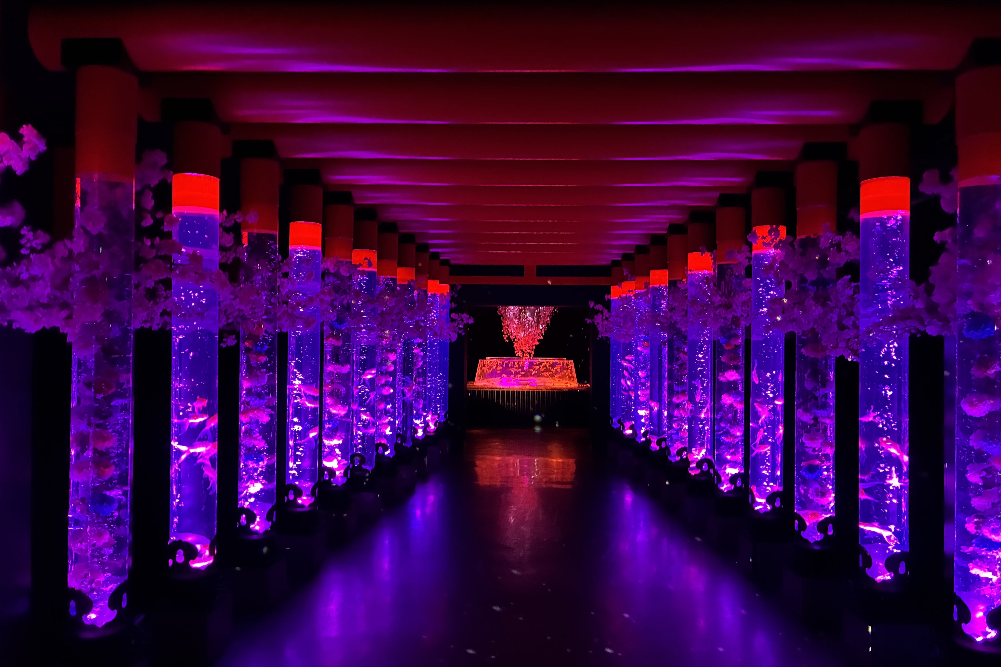 水が湧き出す泉を象徴した円柱水槽「金魚の湧泉」が佇む幻想的な空間。重なり合う桜の繊細なグラデーションとともに、クリスタルやミラーが光を優しく反射し、奥行きのある立体的な美しさが広がります。金魚、光、花が溶け合う、心奪われる“桜の没入空間”です。