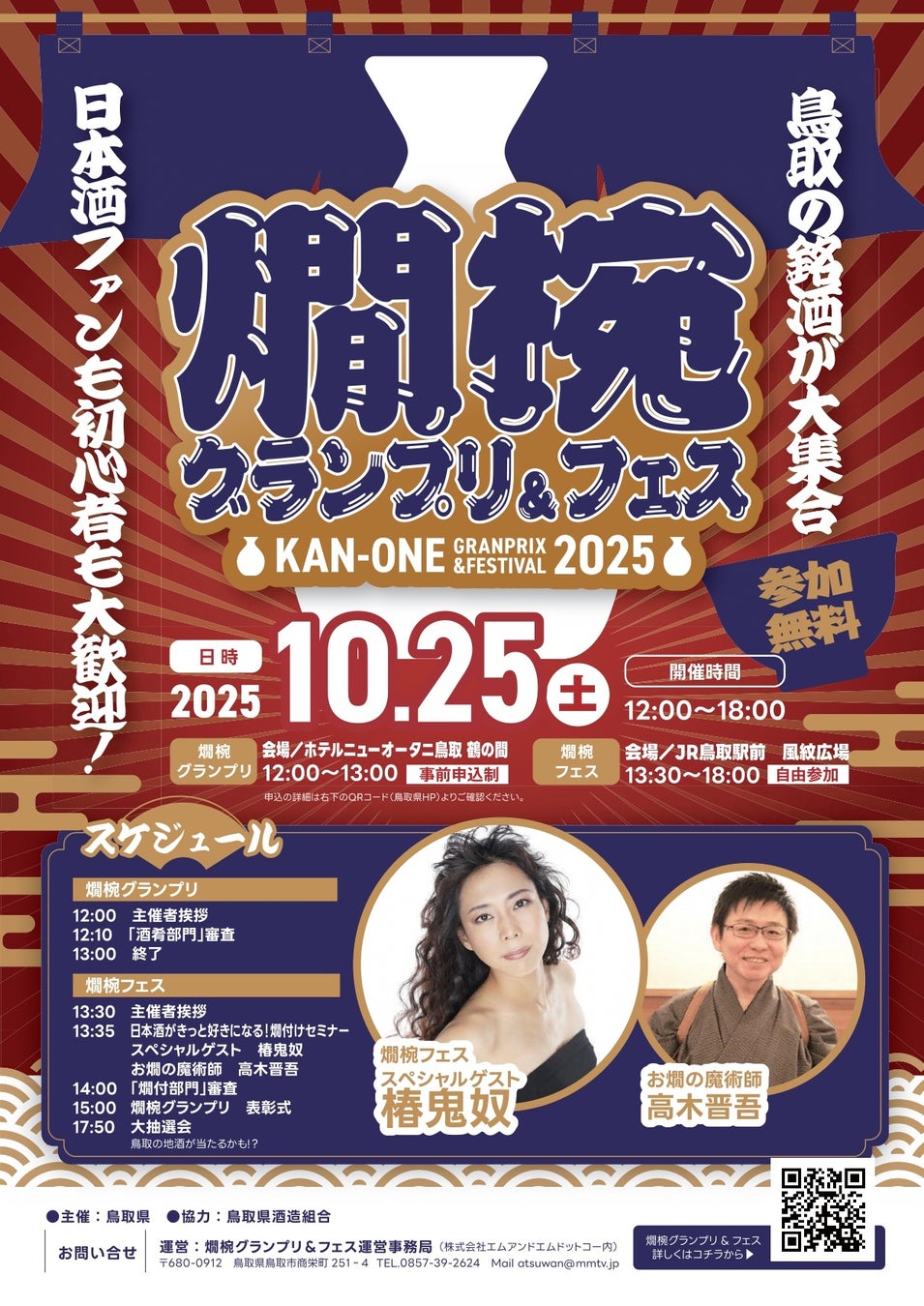 そんな鳥取県が誇る純米酒の魅力を感じられる「燗酒」を主役に、その燗付の「技」と「燗酒と料理のペアリング」を競う「燗椀グランプリ」と、県内の酒蔵10蔵が集結し、ペアリングやトークショーが楽しめる「燗椀フェス」を10月25日(土)に鳥取市で開催します。燗椀フェスでは、スペシャルゲストとしてタレントの「椿鬼奴さん」も来場します。