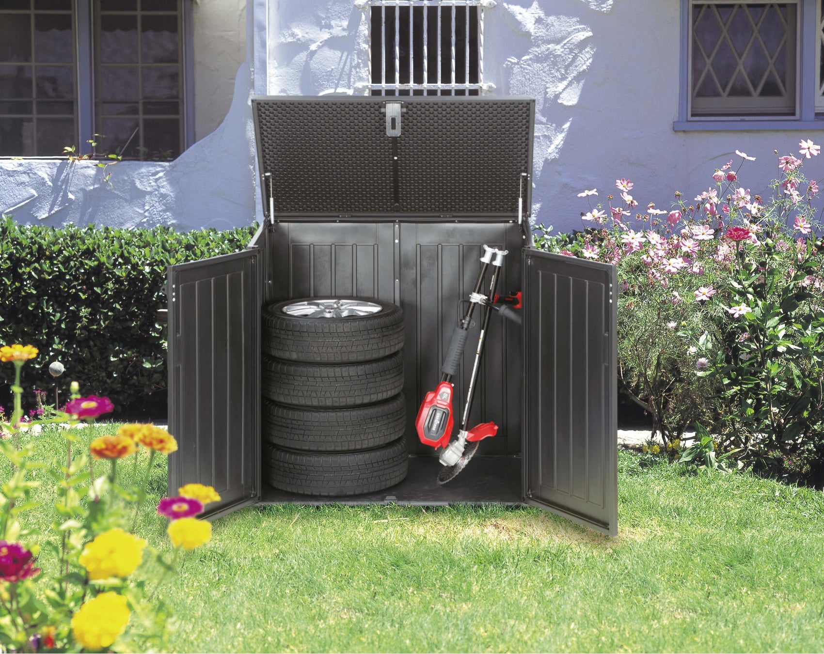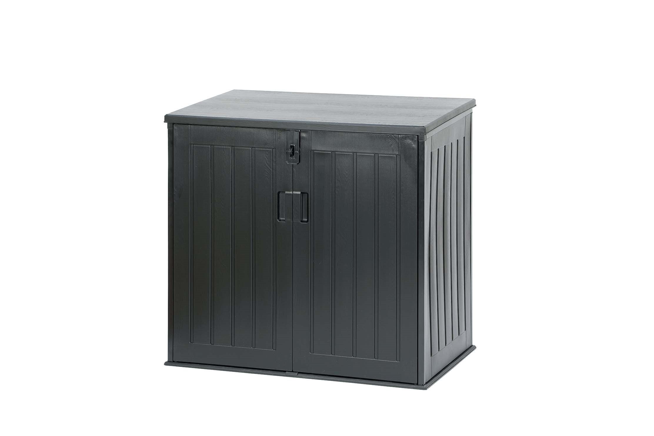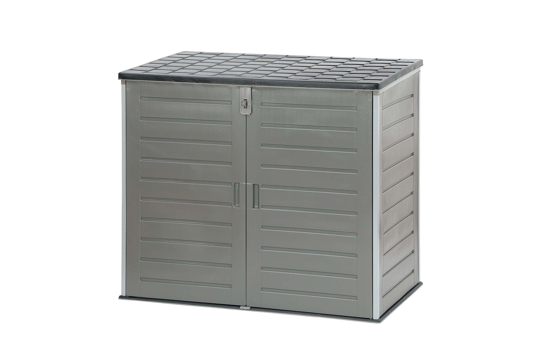 大容量の収納庫のため、折りたたみ自転車やタイヤ、小型農機具まで保管ができます。本商品は、軽い樹脂製素材にもかかわらず、底板は300㎏の重さに耐えられて、南京錠留め具付きで安心してご使用いただけます。また、上蓋と前扉がついておりますので、収納物を楽に出し入れできます。