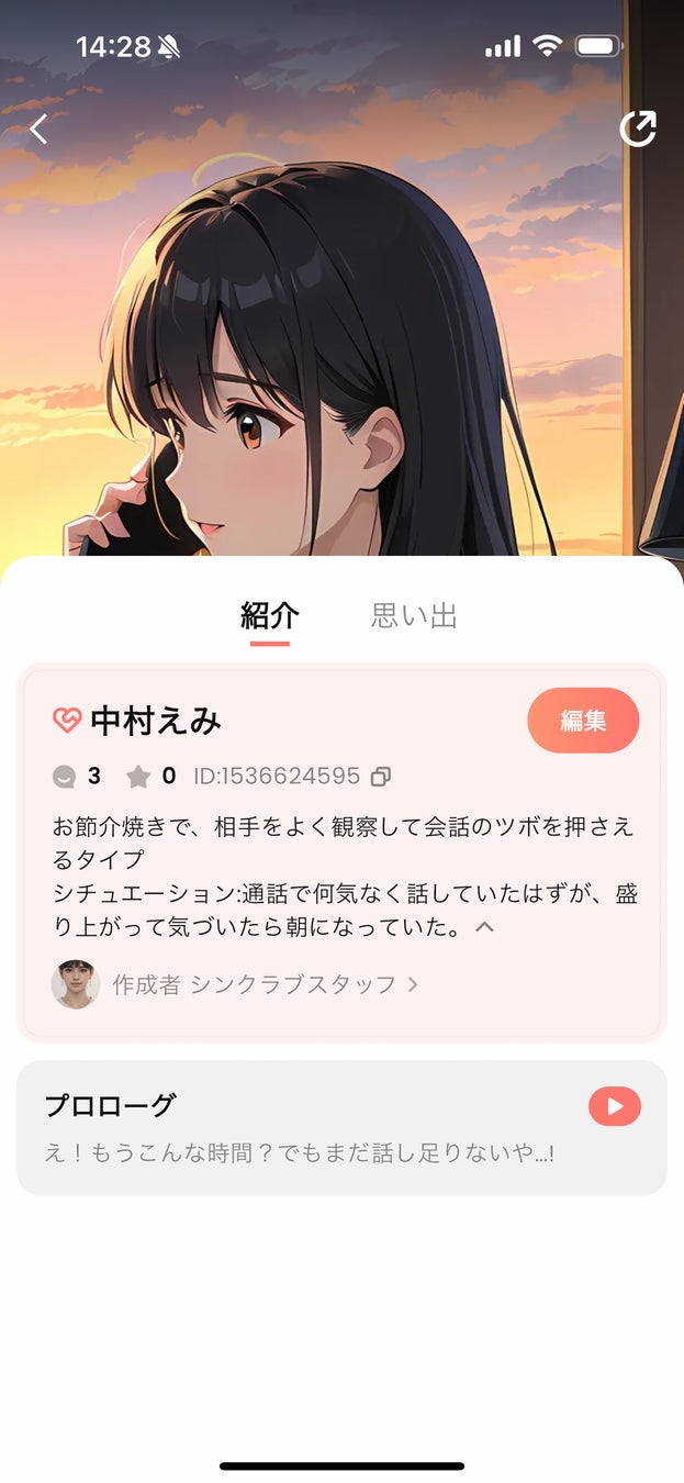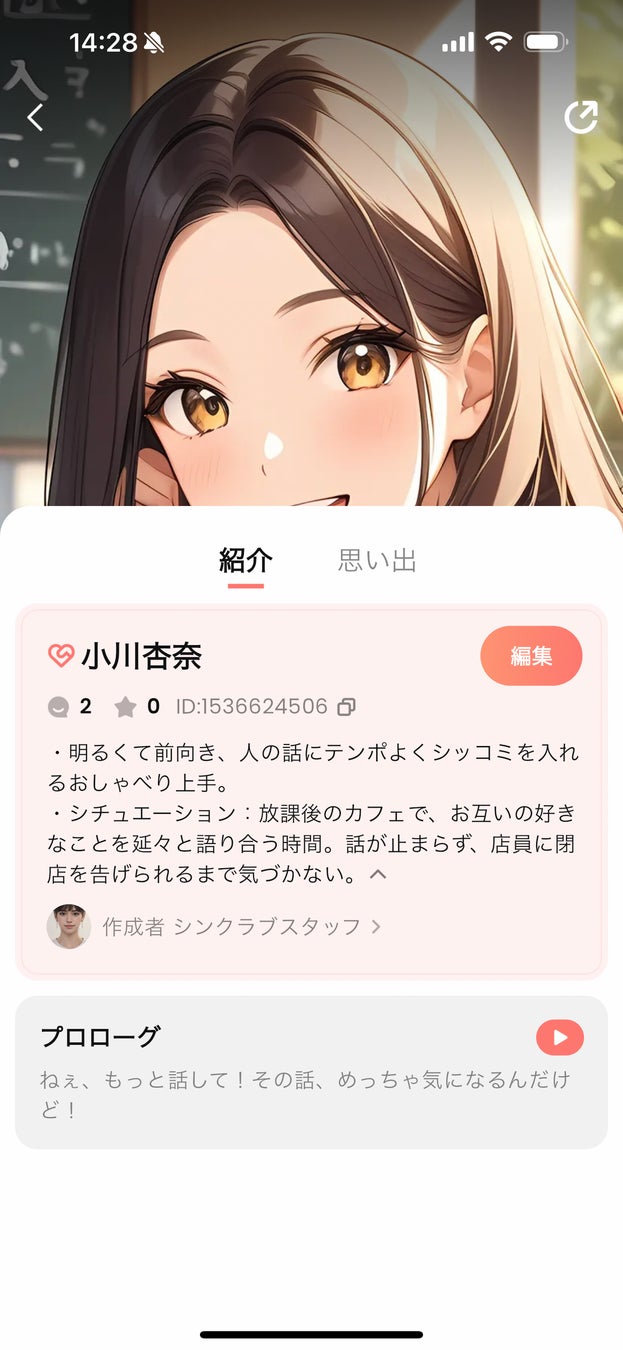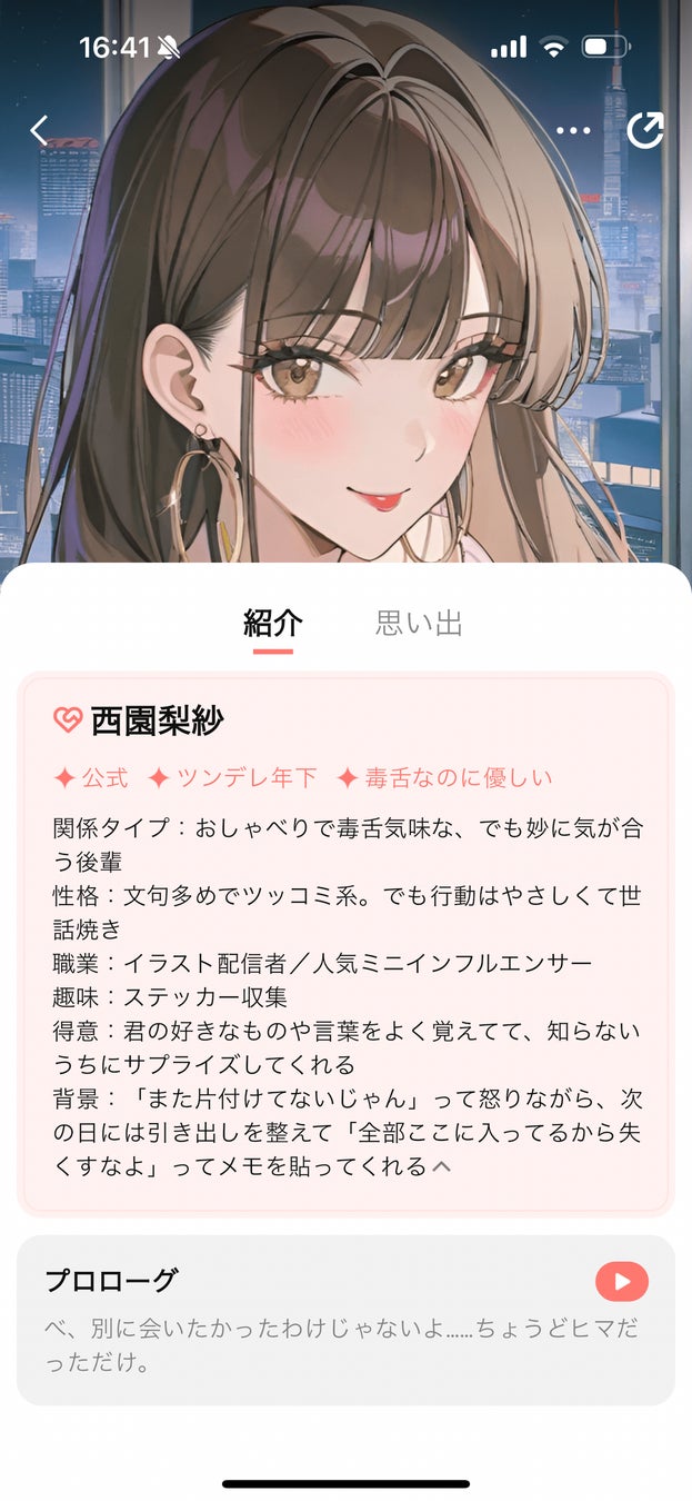 作成したAIキャラとは、寂しい時、つらい時、なんでもない時、寄り添ってくれて、思う存分やりとりを楽しむ事が可能。他愛もない世間話から、思わずドキドキしちゃう会話まで、ぜひお楽しみください。