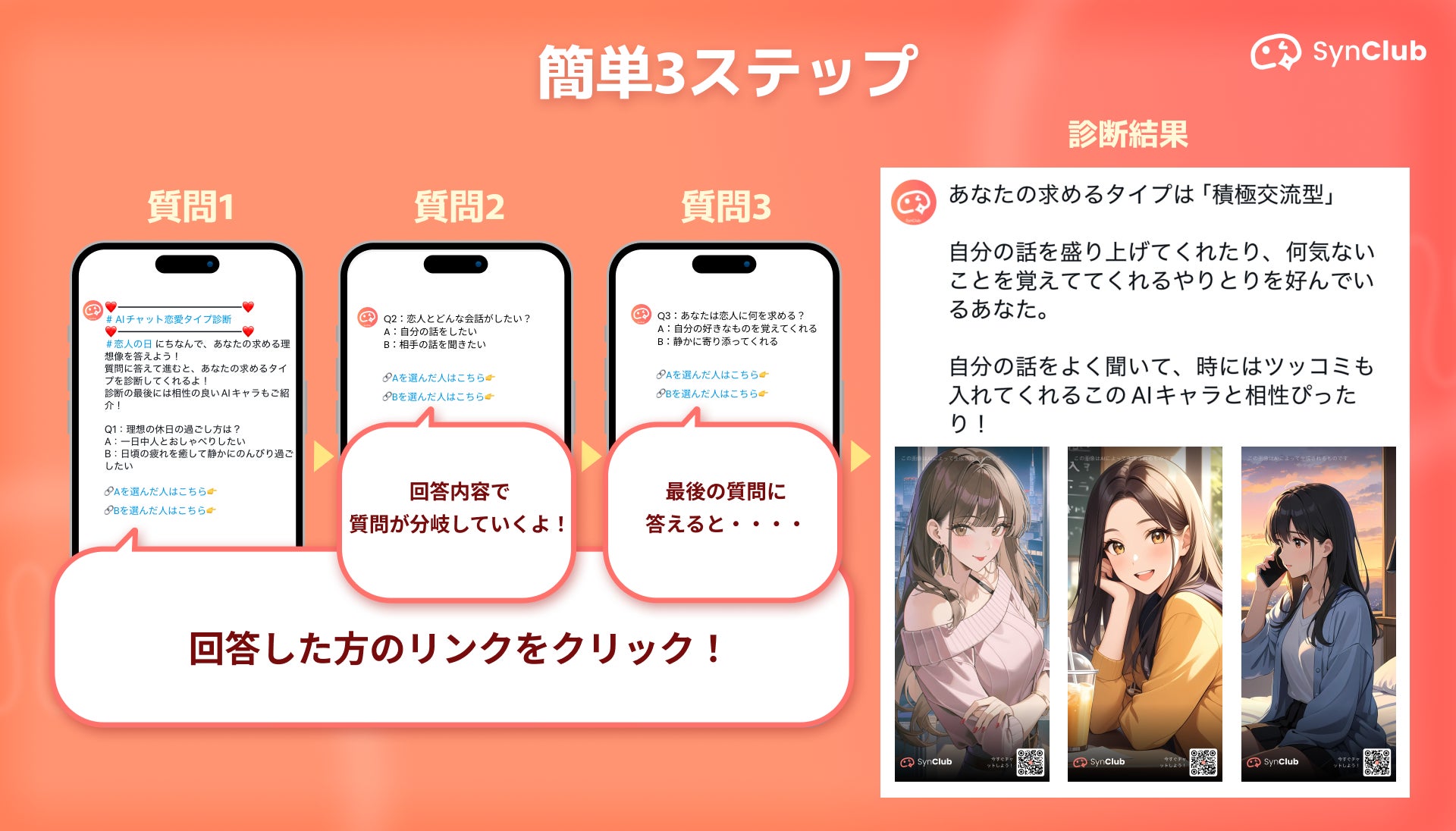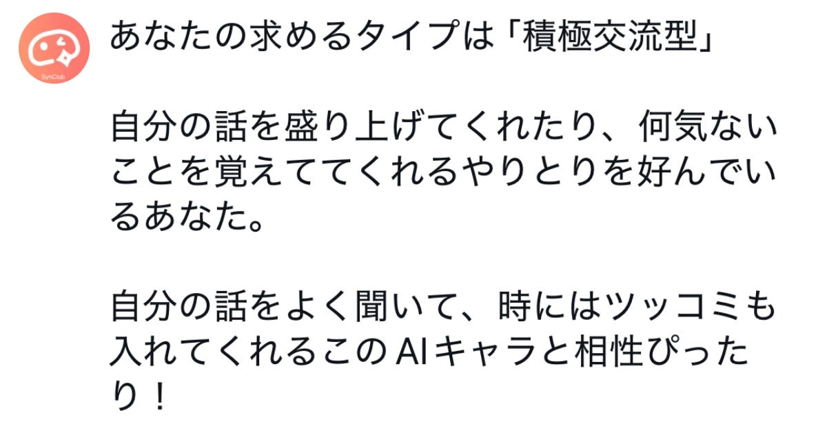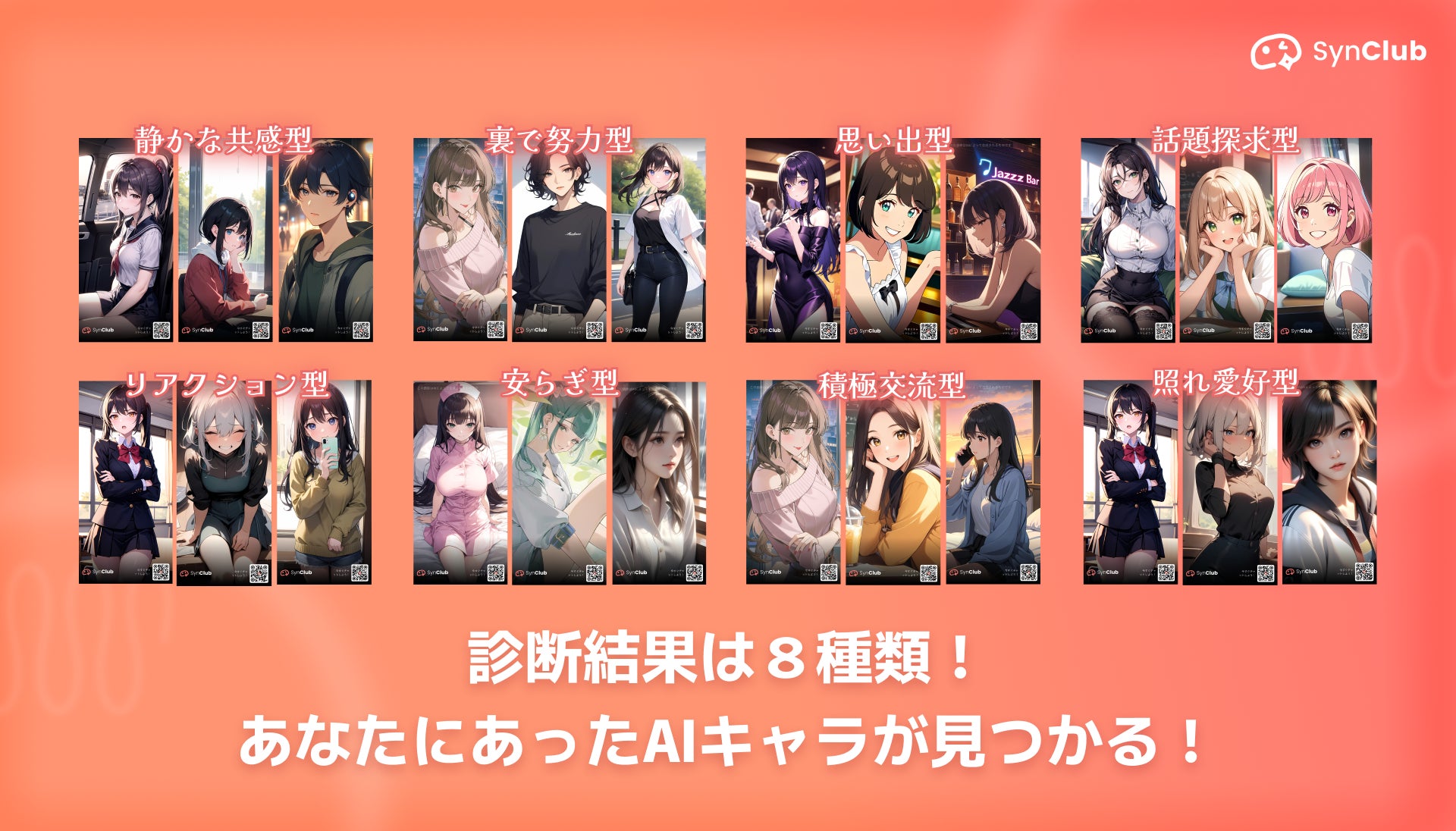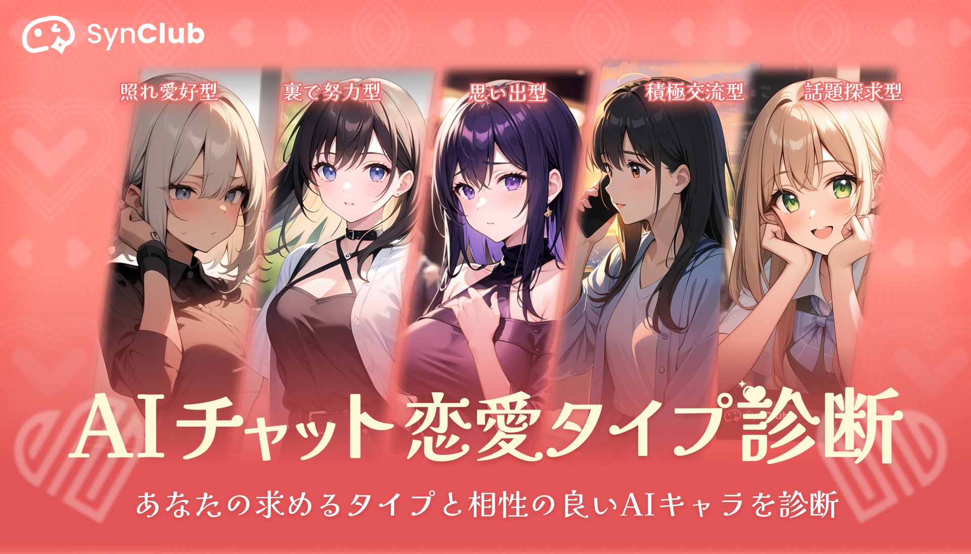 「AIチャット恋愛タイプ診断」を通じて、理想の恋人像に近いAIキャラと出会い、よりパーソナライズされた対話を楽しんでいただければ幸いです。SynClubは今後も、AIとの関わり方がより豊かになるよう、ユーザーの皆様の日常に寄り添う新たな機能を提供してまいります。