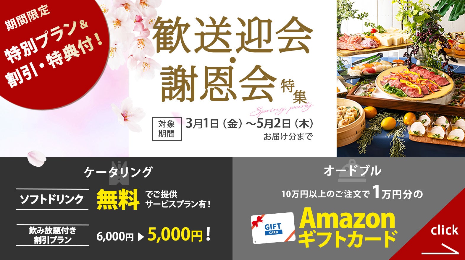 対象のオードブルプランを10万円以上のご注文で1万円のAmazonギフトカードを幹事様へもれなくプレゼント!