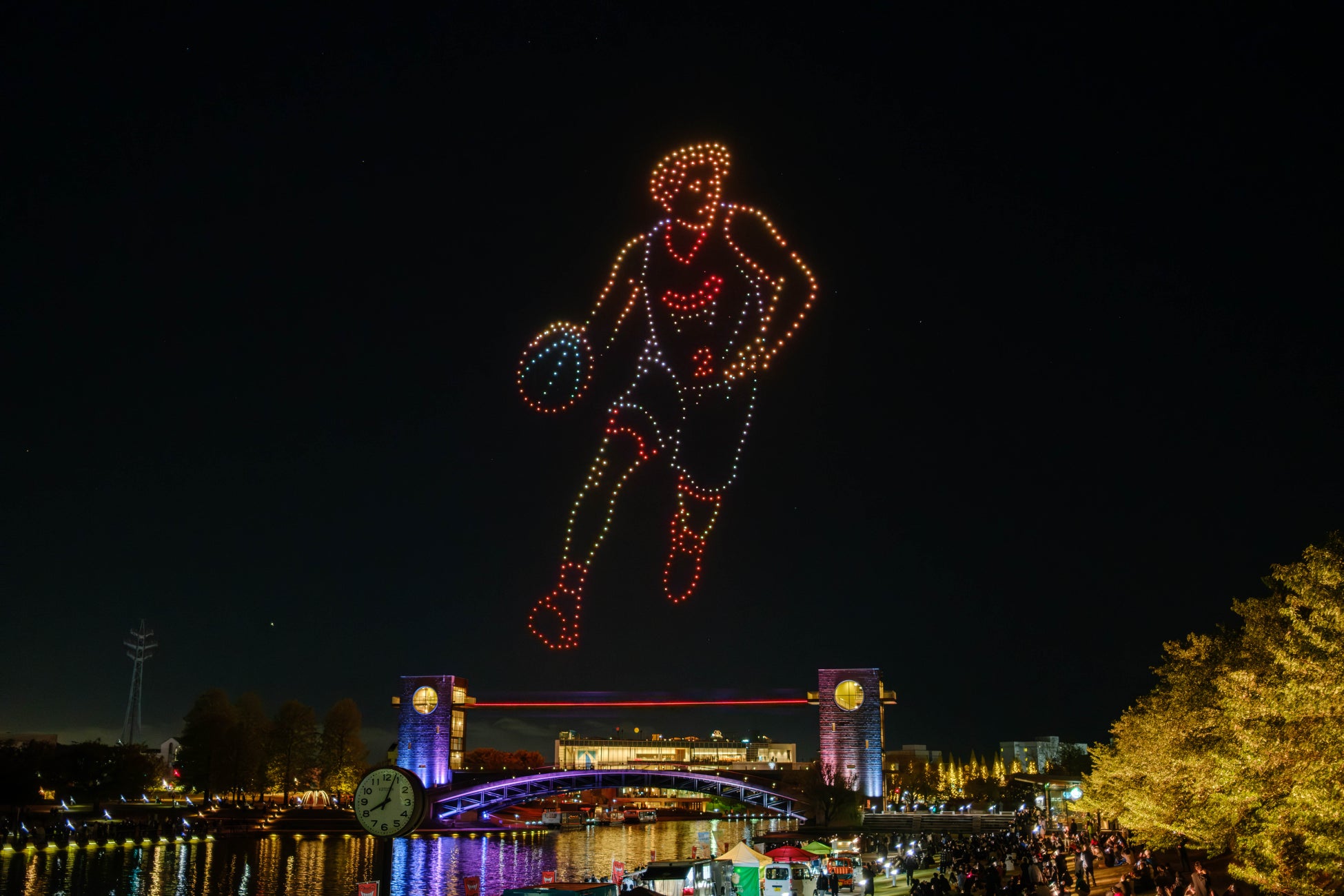 続いて「B.LEAGUEロゴ」、そして躍動するバスケットボールが夜空に出現し、富山グラウジーズの選手たちをイメージさせる、ダンクやシュートといったハイライトプレーが次々と描き出されました。さらに富山県の県鳥「ライチョウ」をモチーフにした富山グラウジーズの公式マスコット「グラッキー」が夜空に浮かび上がり、富山グラウジーズブースターにとって忘れがたい瞬間が展開されました。