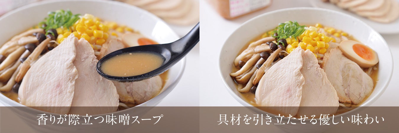 トッピングの具材となる、鶏むねチャーシューには、塩こうじを液体化した「液体塩こうじ」を使用することで、うま味が増し、分厚いチャーシューがやわらかく仕上がっています。さらに、スープには、塩こうじを粉末化した「熟成こうじパウダー」を加えることで、深い味わいを実現しました。