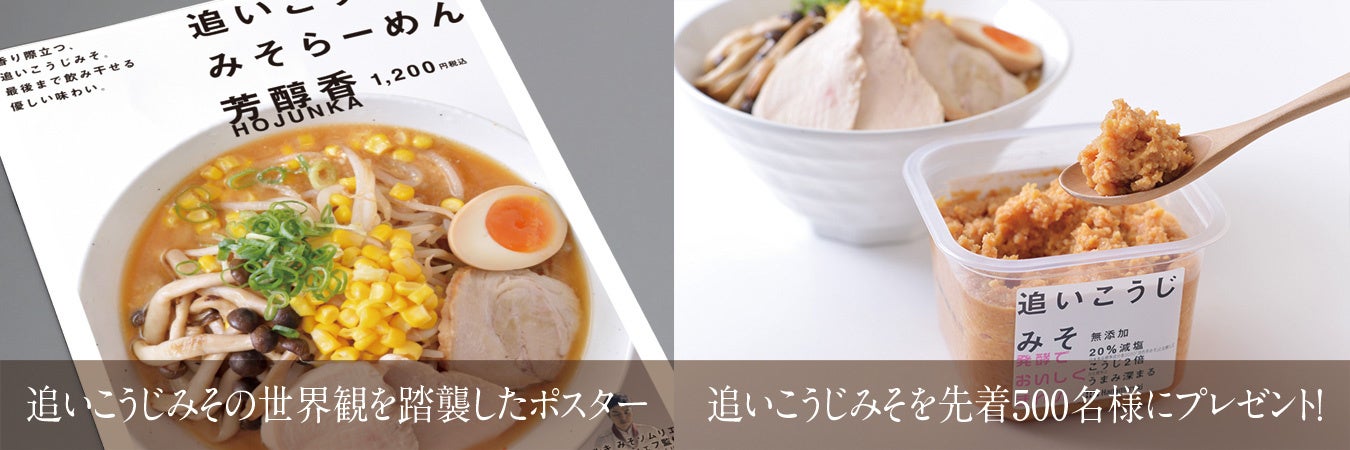 直久各店舗では、追いこうじみそのパッケージデザインの世界観を踏襲したポスターで「追いこうじみそラーメン・芳醇香」をPRします。また、「追いこうじみそラーメン・芳醇香」を召し上がっていただいたお客様の中から抽選で500名様に「追いこうじみそ 650g」をプレゼントします。