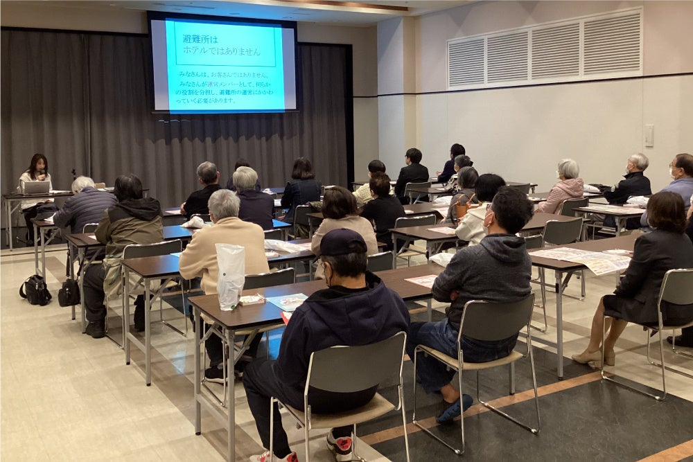 避難所での過ごし方や、避難者全員で運営する避難所の仕組み、災害時に発生する問題に対して地域の人々が協力して取り組んでいく必要性など、参加者の皆様も真剣に耳を傾けている様子でした。