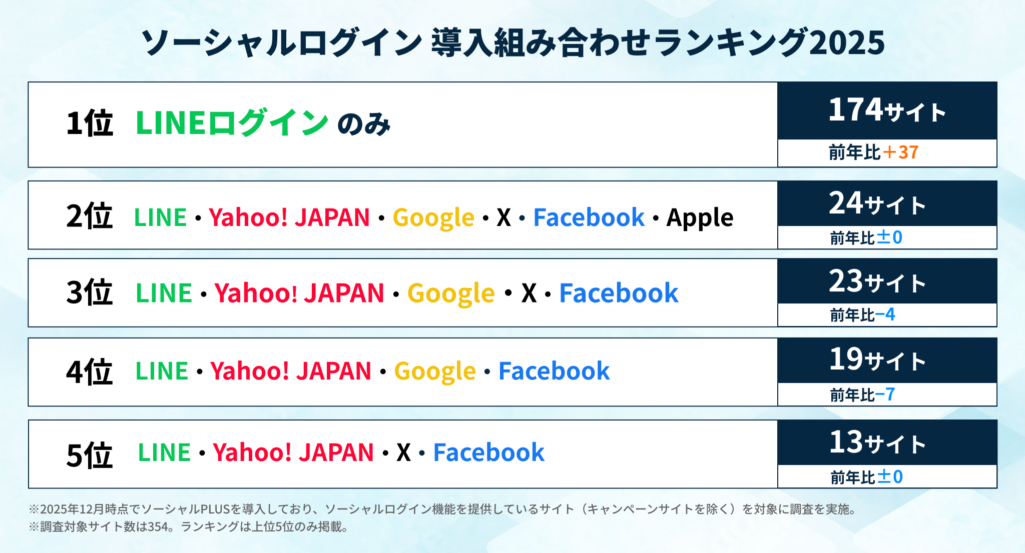 ・調査対象サイト:ソーシャルPLUSを導入しており、2025年12月時点でソーシャルログイン機能を提供している全サイト(354サイト)で、一般消費者向けのECサイトや求人サイトが中心