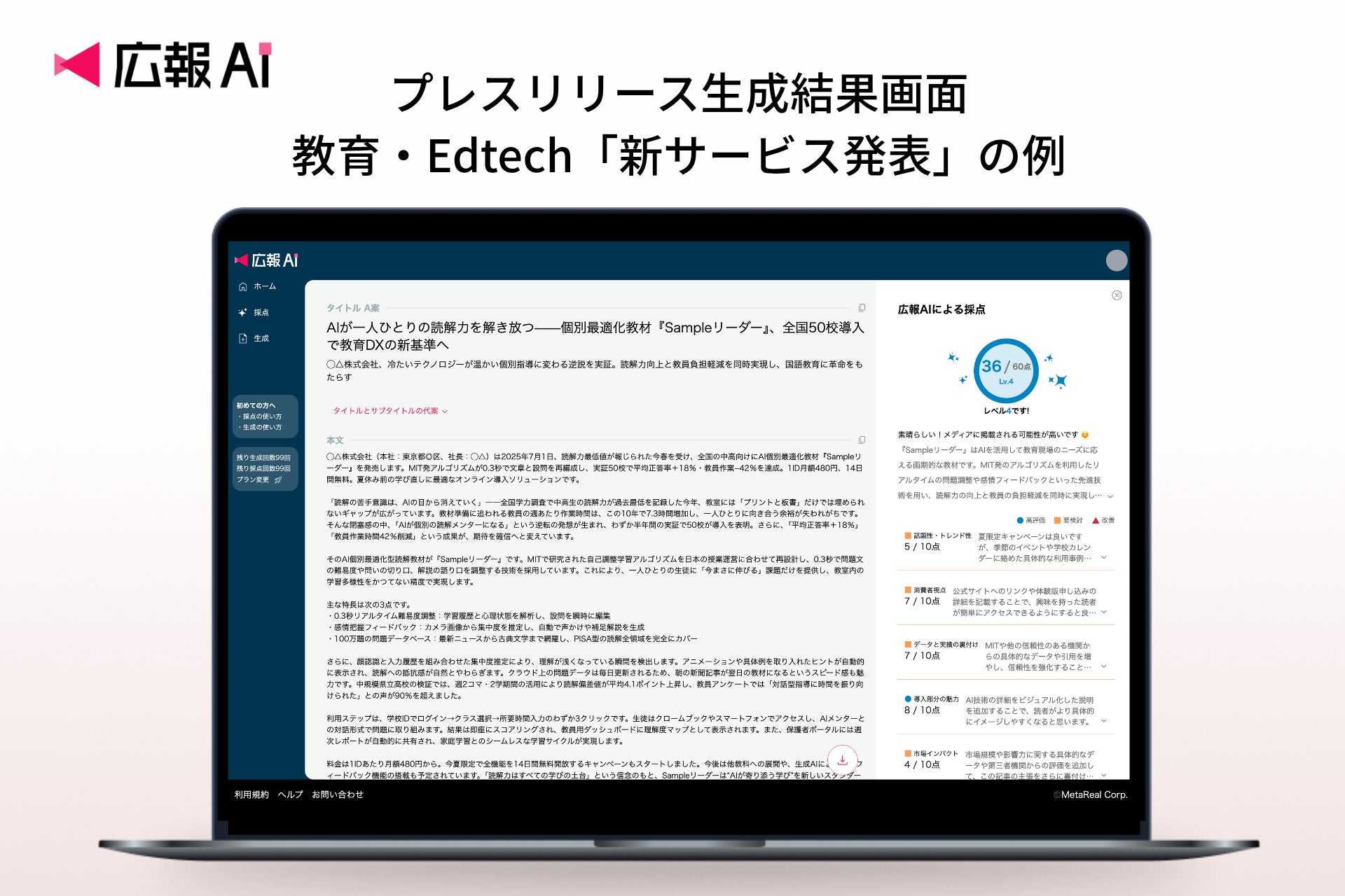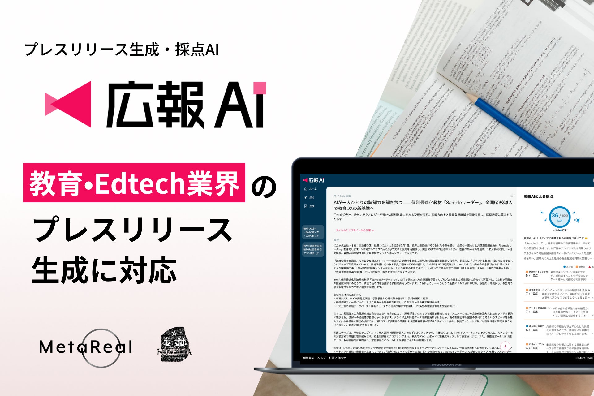 業種特化の専門AI開発・運営を行うメタリアル・グループの株式会社ロゼッタ(本社:東京都千代田区、代表取締役:五石 順一)が提供する、メディアに掲載されやすいプレスリリースを生成・採点可能な『広報AI』が、教育・EdTech業界のプレスリリース作成に対応しました。保護者・教育機関・生徒など多様な関係者の視点に基づく文章を生成し、教育サービスの魅力をわかりやすく伝えることが可能です。