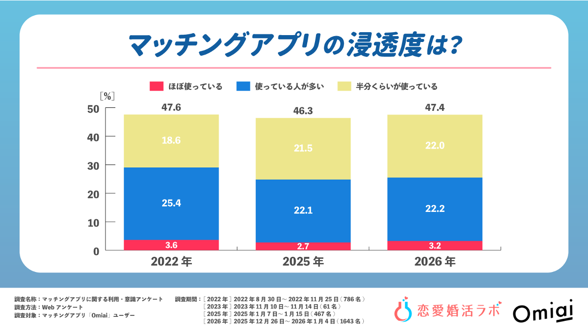 周囲でのマッチングアプリ浸透度について尋ねたところ、「半分くらいが使っている」との回答は、2022年18.6%、2025年21.5%、2026年22.0%となり、緩やかな上昇傾向が見られました。