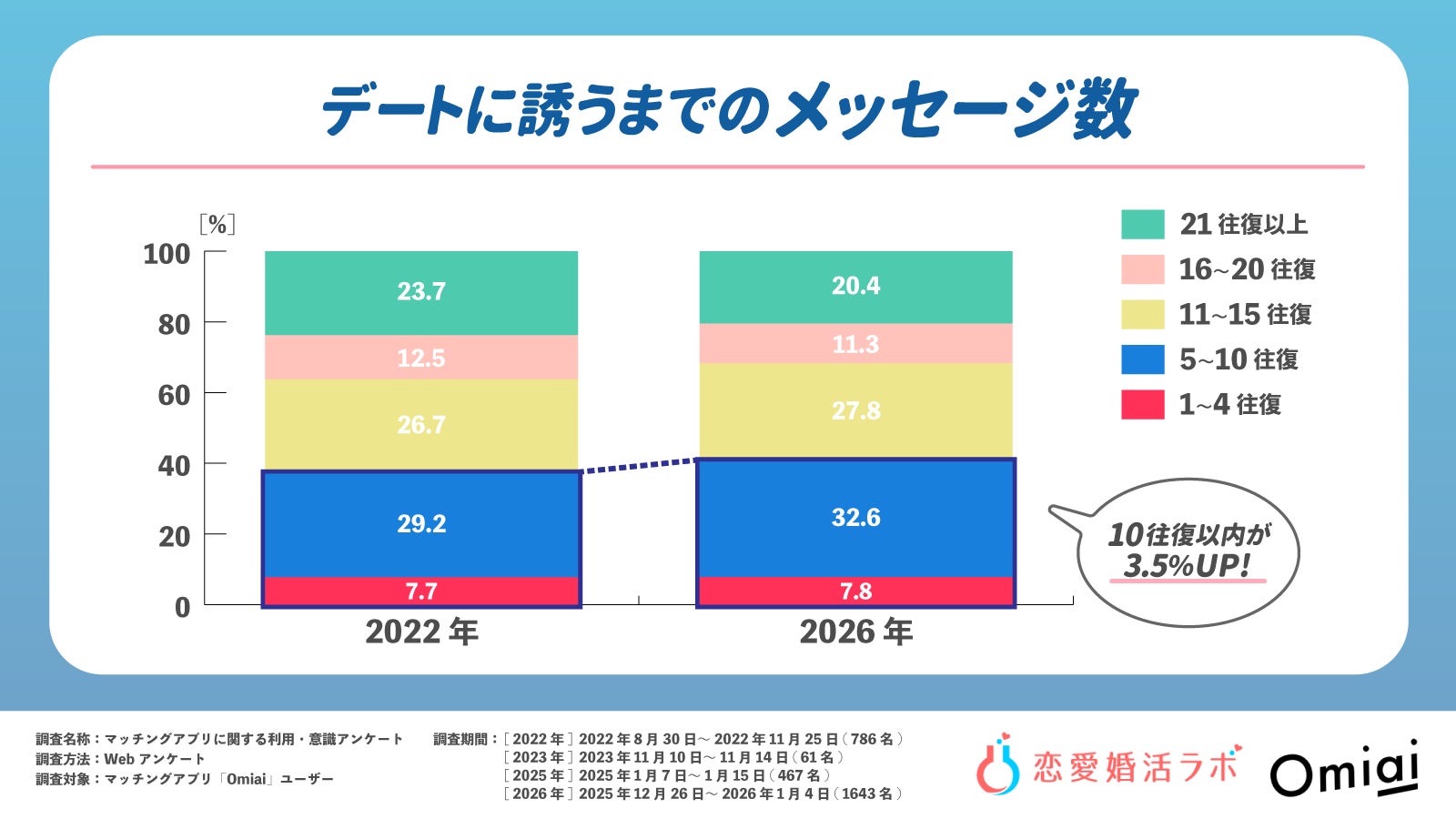 デートに誘うまでのメッセージ数を見ると、「5〜10往復以内」は2022年29.2%から2026年32.6%へ増加しました。一方で、「21往復以上」は2022年23.7%から2026年20.4%へ低下しています。