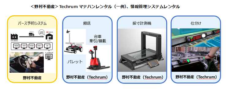 野村不動産では、自動化機器の効率的な活用により物流オペレーションの最適化を行うためのプログ「Techrum (テクラム)」を2021年4月に開始いたしました。今回本施設では、「Techrum(テクラム)」に参画しているパートナー企業の持つ自動化機器等を、テナントに対してレンタルサービス提供します。ピッキングや荷物の積み下ろしなどを支援するマテハンロボット※1及びWMS(倉庫管理システム)※2を必要に応じてレンタル可能とすることで、庫内作業の省人化・効率化を実現し、労働力不足問題の解決を目指します。