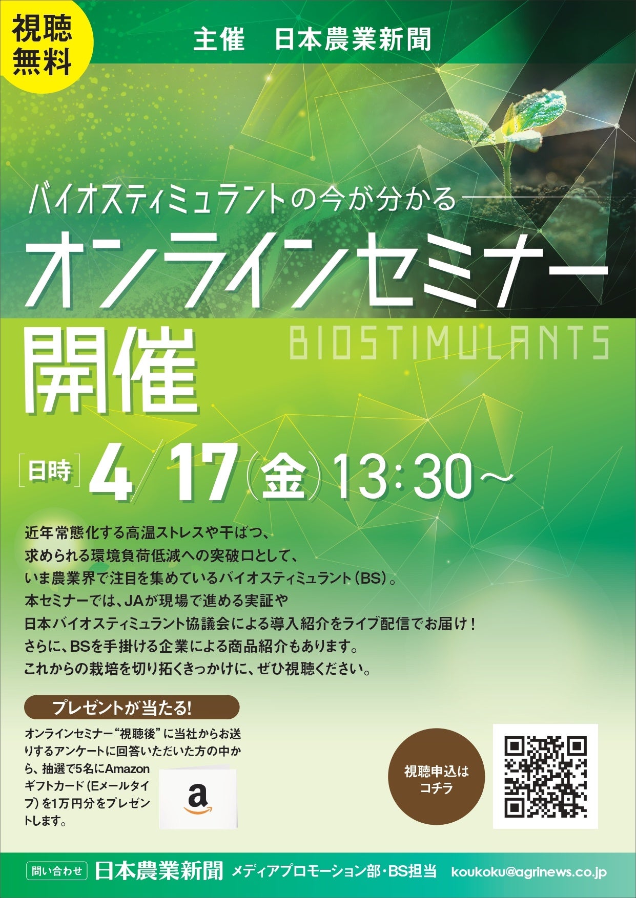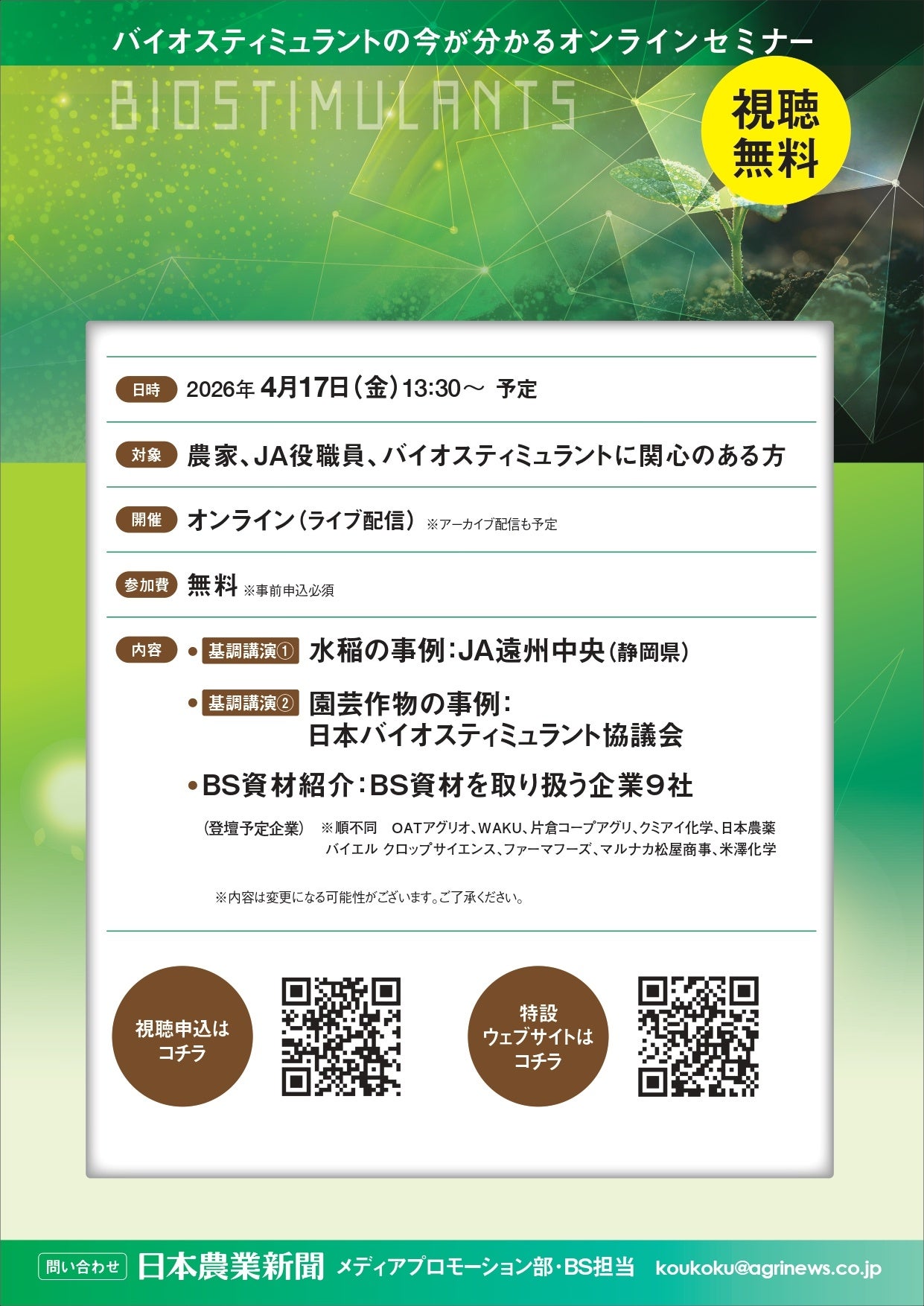 バイオスティミュラント(BS)、オンラインセミナー視聴申込受付中!BS活用のヒントに!!/日本農業新聞
