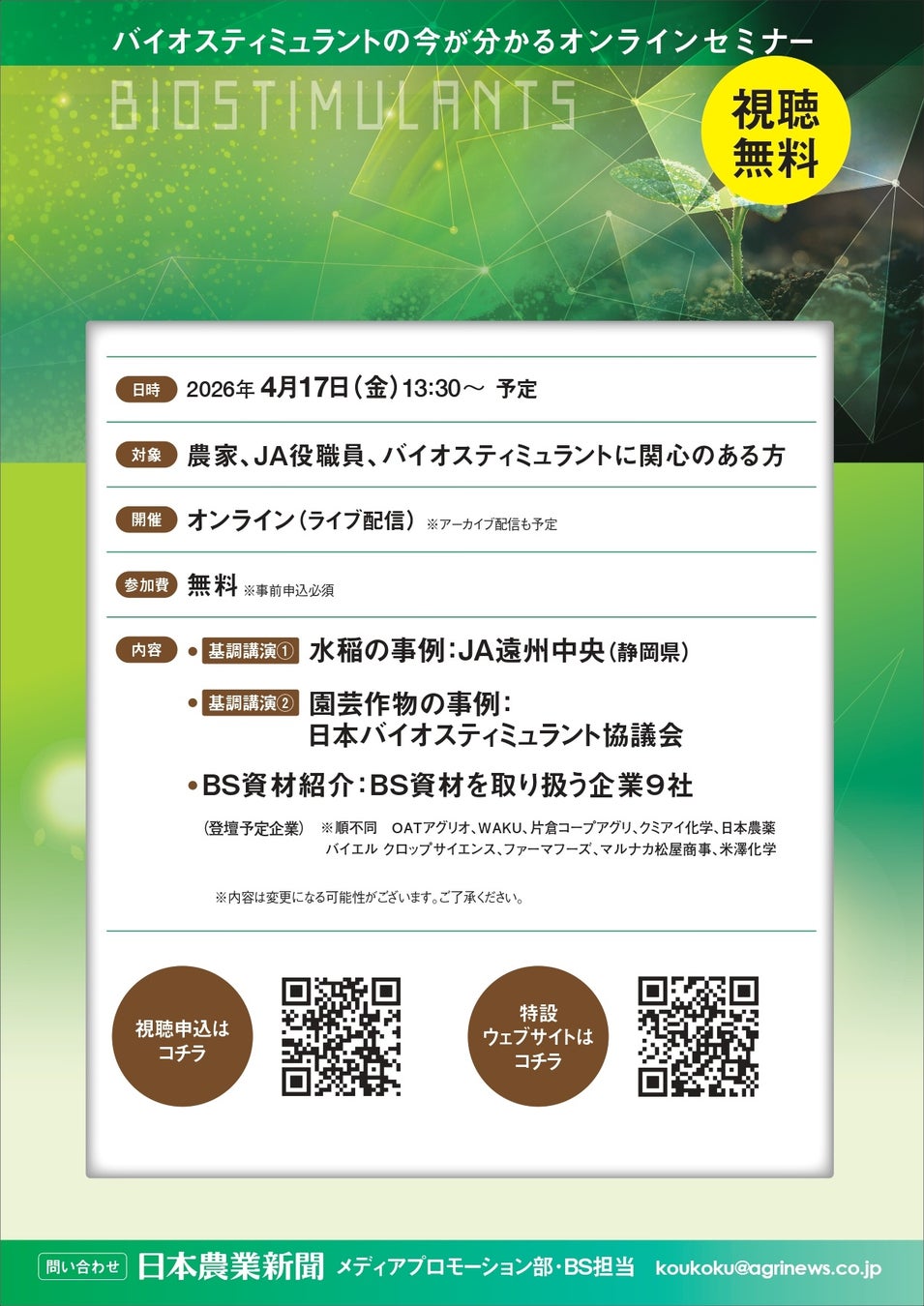 その他、BS資材を取り扱う企業9社が、各社イチ押しのBS資材をアピールします。視聴申し込みは4月15日(水)まで。申し込みは、特集紙面(4月3日(金)付)に掲載されたQRコードや、または特設ウェブサイト上のバナーから、申込フォームにアクセスいただき、必要事項をご入力ください。