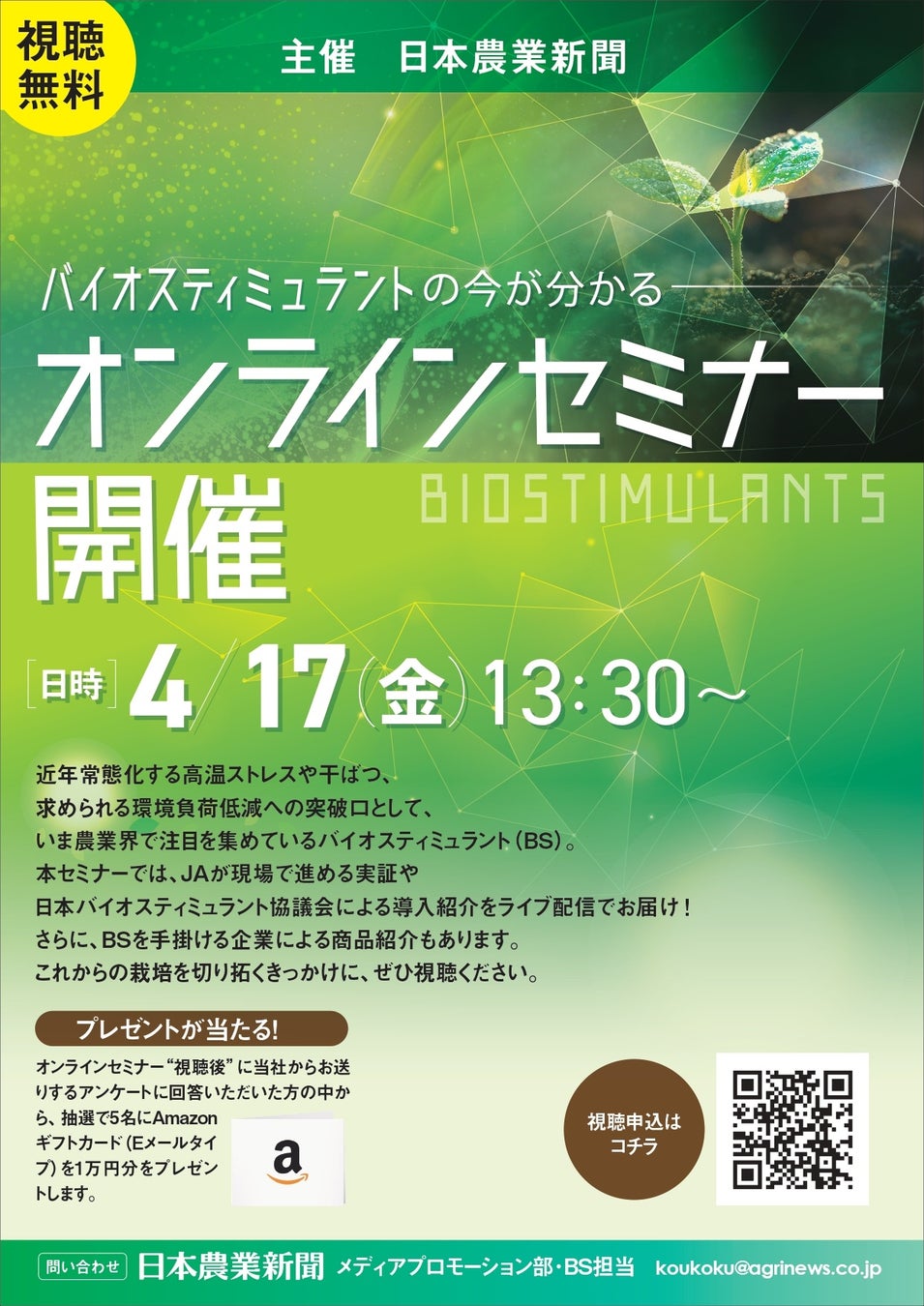 日本農業新聞(東京都台東区、代表取締役社長:田宮和史郎)は4月17日(金)、「バイオスティミュラント(BS)資材」のオンラインセミナーを配信します。
